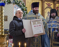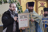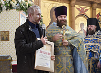 После богослужения отец Павел обратился со словами благодарности ко всем, кто причастен к благоукрашению храма росписями. И вручил Благодарственные грамоты Управляющего Сергиево-Посадской епархии епископа Сергиево-Посадского и Дмитровского Фомы за усердную и жертвенную помощь в благоукрашении храма Похвалы Пресвятой Богородицы Валерию Васильевичу Кобец, начальнику сектора линейных ускорителей Объединенного института ядерных исследований; иконописцу Александру Николаевичу Ачкасову, руководителю иконописной мастерской г. Сергиев Посад, и иконописцу Александру Николаевичу Гусаковскому.