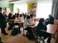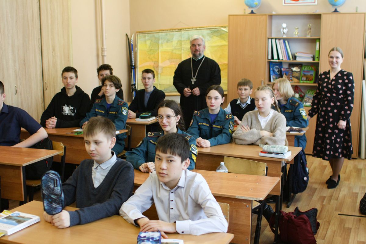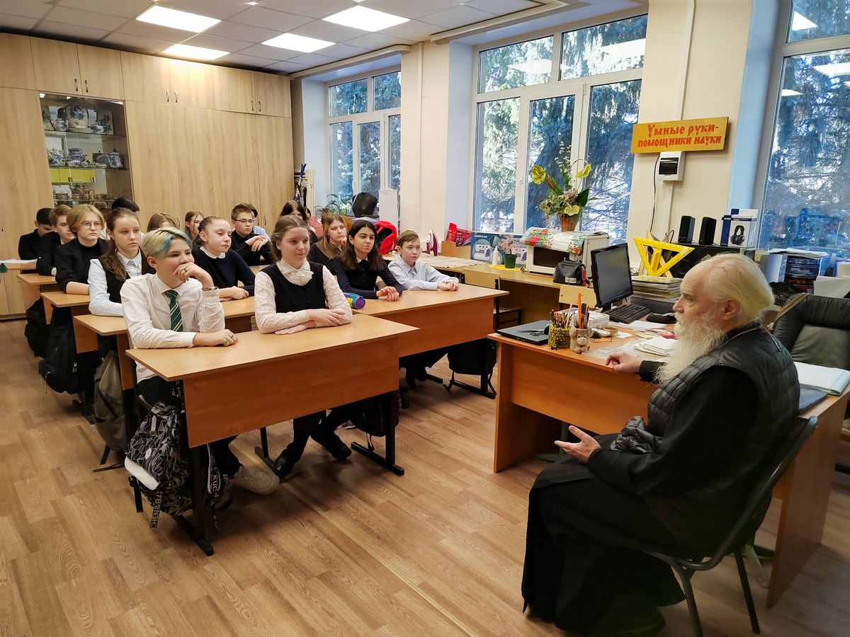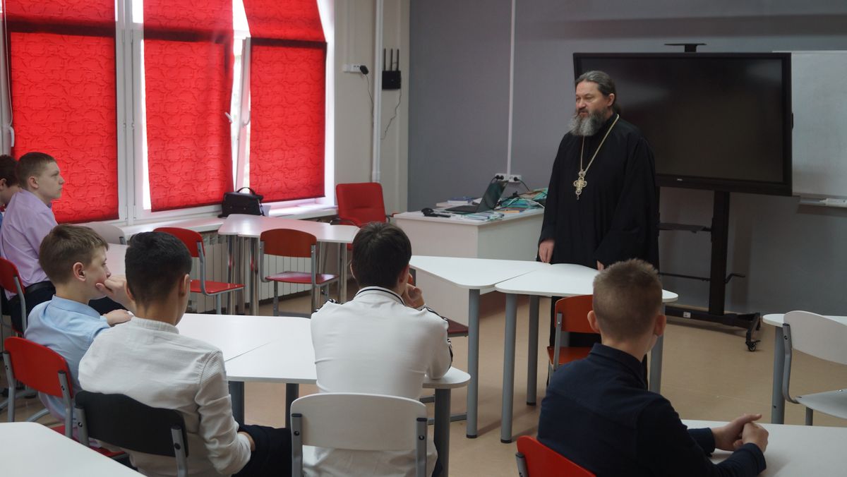 Благочинный протоиерей Сергий Рыбаков побеседовал с учащимися 8 класса МБОУ лицея «Воскресенская кадетская школа» с. Усадищи и учащимися 4-х, 7-х и 10-го классов МОУ «СОШ №99» с. Конобеево.