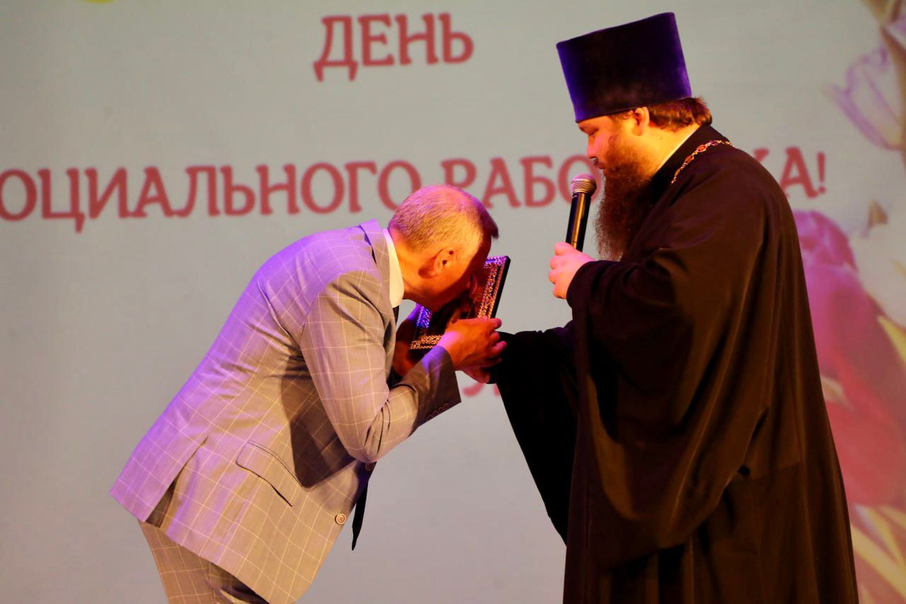Отец Александр обратился к присутствующим со словами поздравления и вручил начальнику Павлово-Посадского отдела социальной защиты населения В. Н. Зайцеву икону святителя Луки Крымского.