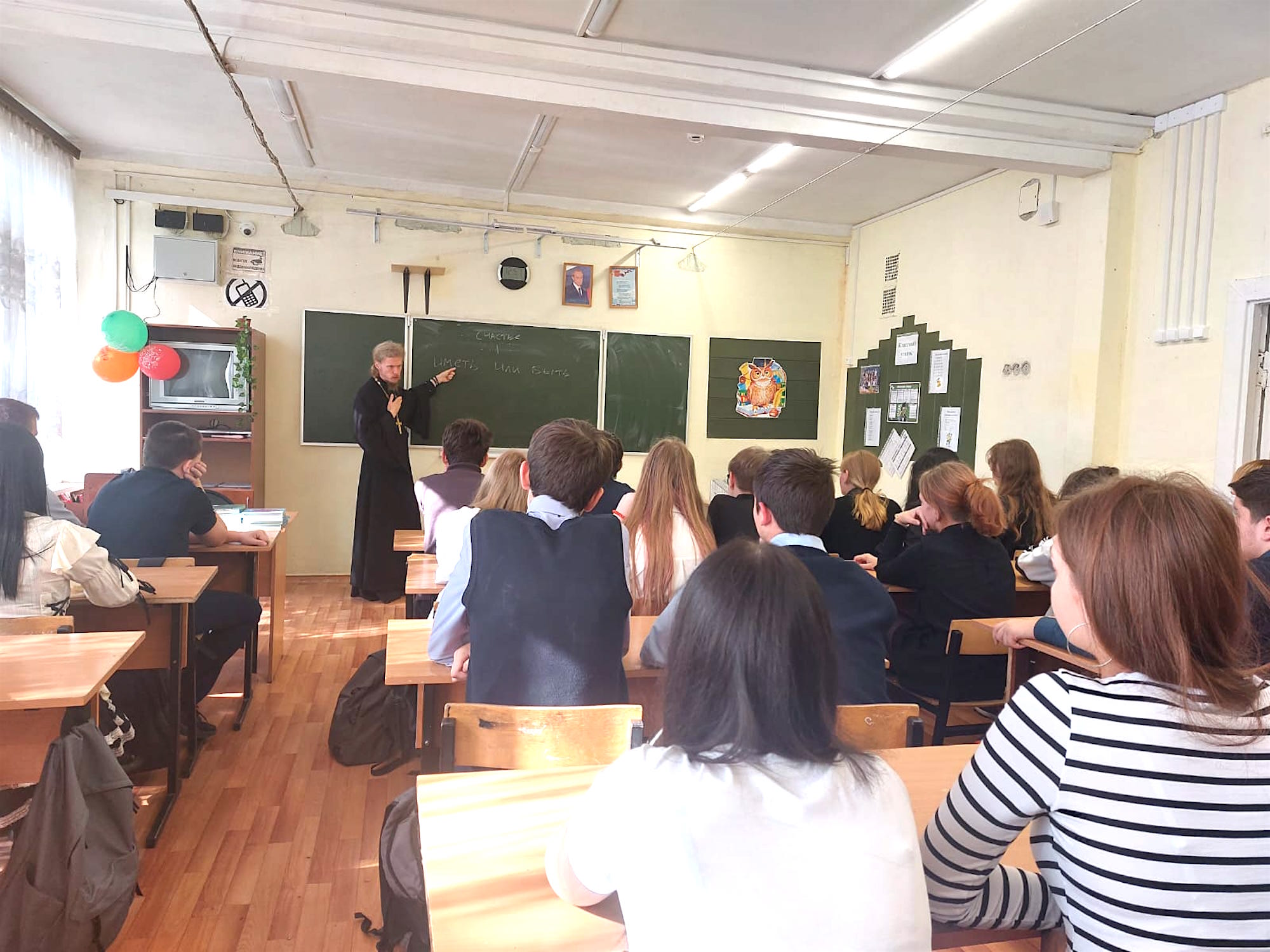В ходе посещения отец Димитрий провел два урока с 3Ж классом и с девятыми классами. На уроках поднимались темы взаимопонимания, уважения и помощи, зависимостей, любви и духовности.