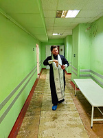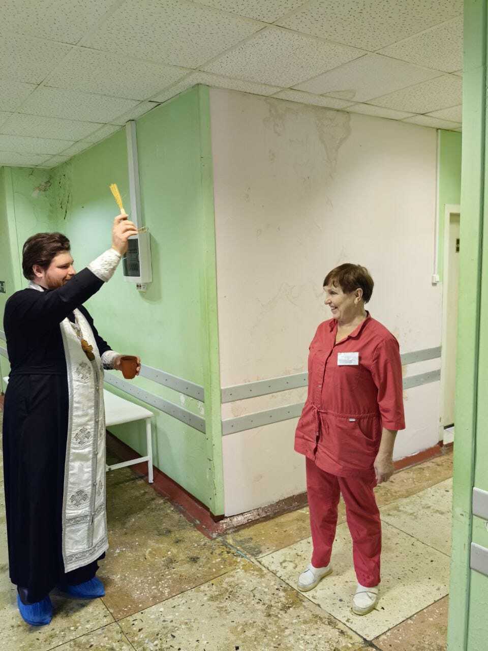 В ходе посещения отец Димитрий окропил помещения больницы и поздравил с праздником сотрудников и пациентов. В больницу были переданы бутыли со святой водой.