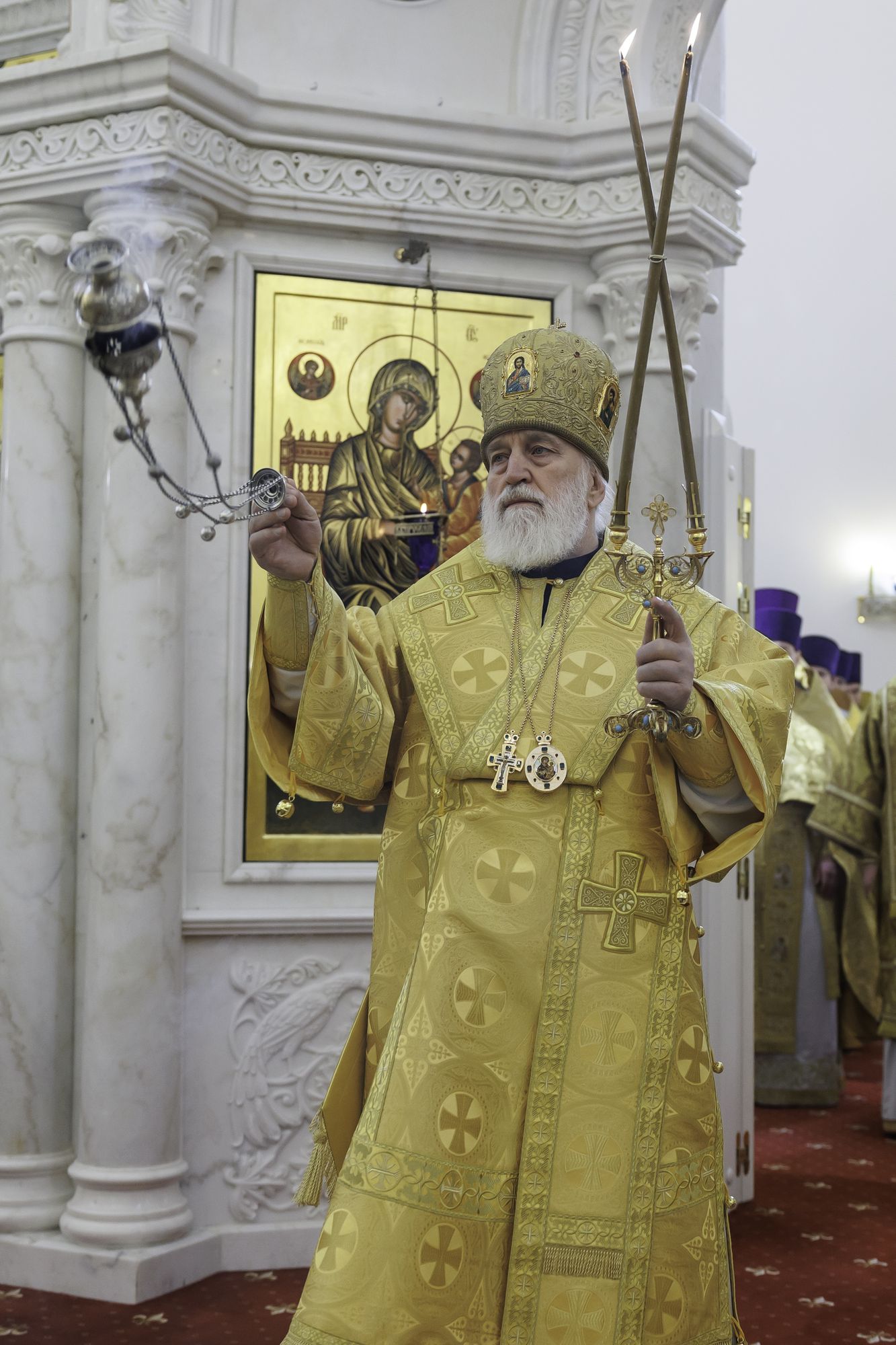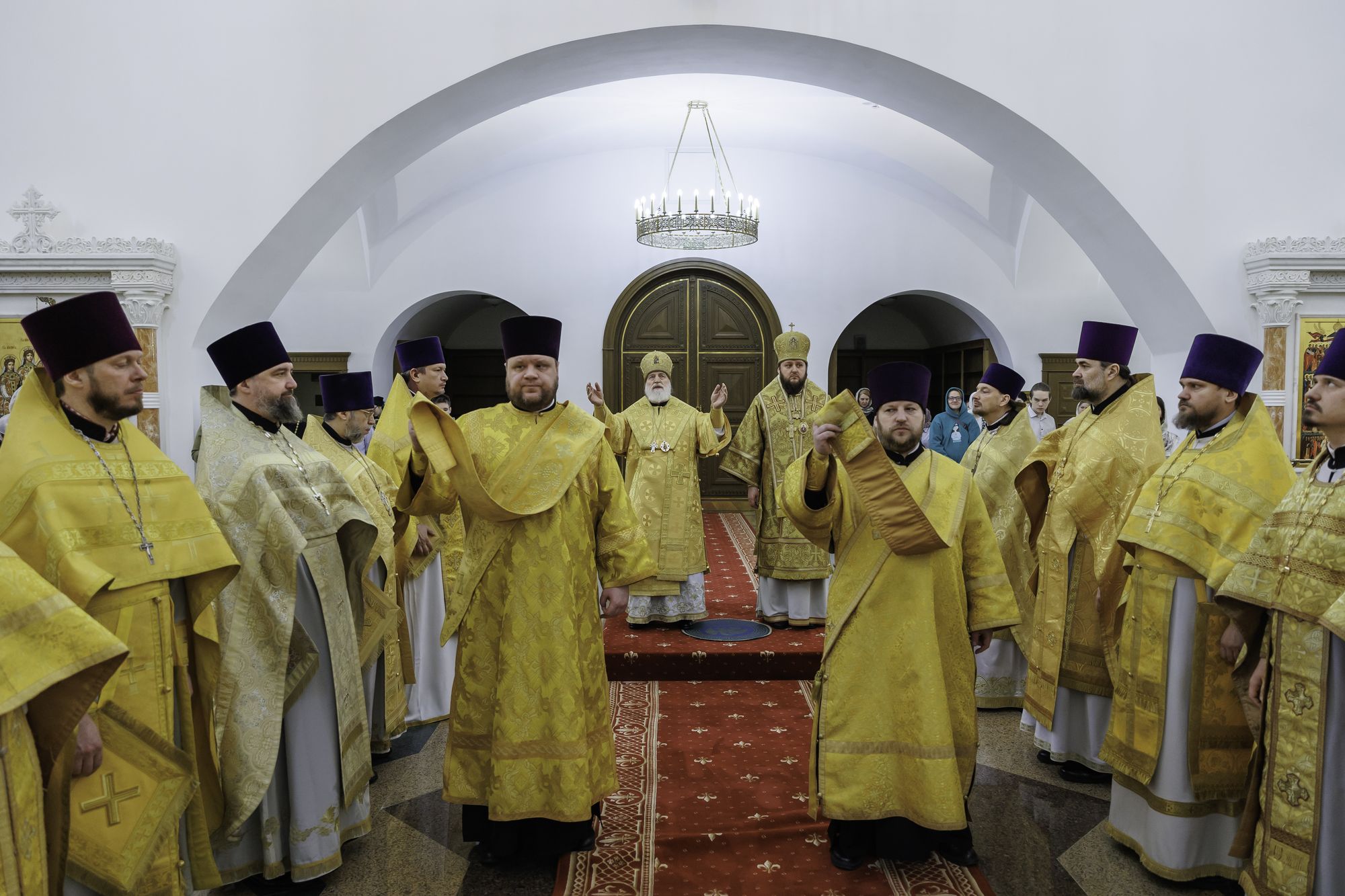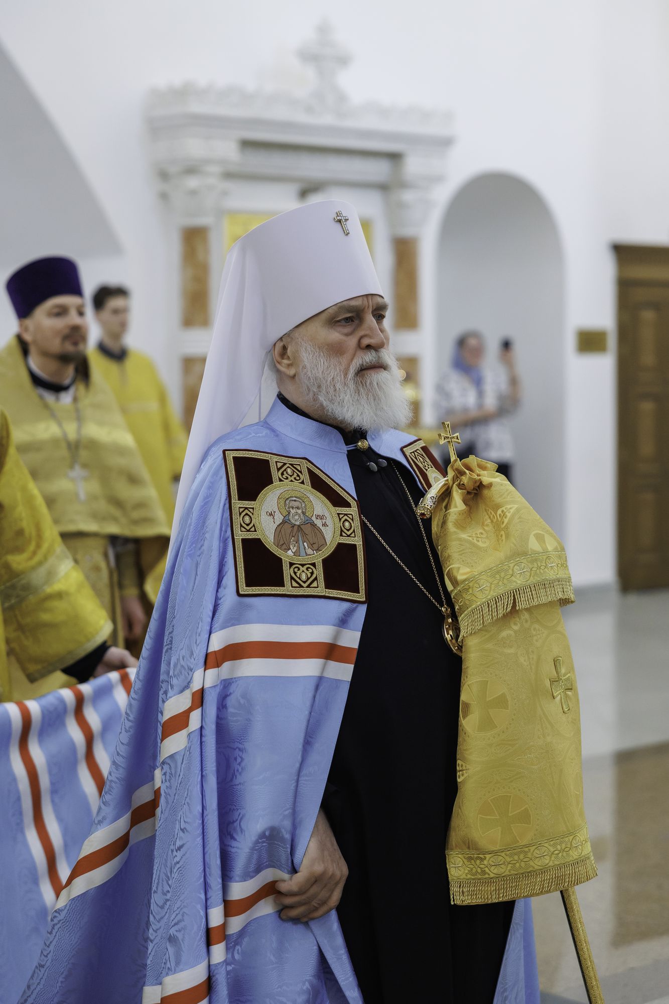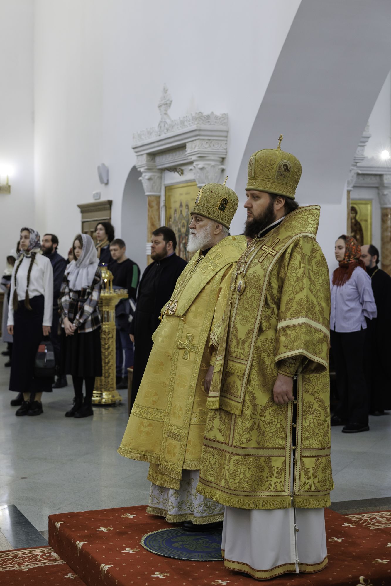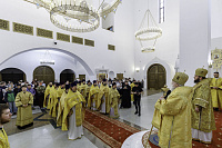 Архипастырям сослужили: секретарь Святейшего Патриарха по Московской области протоиерей Дионисий Казанцев, руководитель Юридической службы Московской митрополии, настоятель собора иерей Василий Лосев, Ректор Коломенской духовной семинарии протоиерей Вадим Суворов и духовенство Московской митрополии, прибывшее на праздник.