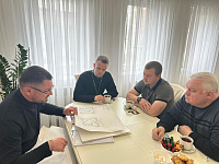 19 апреля в рабочем кабинете благочинного 1-го Бронницкого округа в приходском доме Михаило-Архангельского собора г. Бронницы состоялось совещание настоятеля иерея Сергия Себелева, директора "ЗВО "Инновент", депутата городского Совета депутатов Сергея Анатольевича Дуенина, представителя ООО "Домок" Дмитрия Евгеньевича Васильева и руководителя реставрационной организации ООО "СРК Арт-Руст" Александра Степановича Чорба по вопросам реставрации колокольни соборного комплекса.