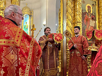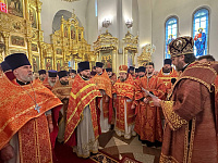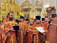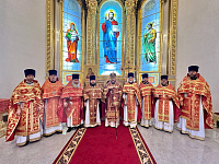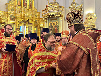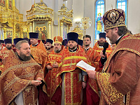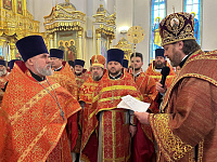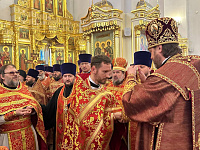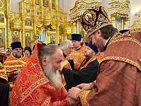 В алтаре собора владыка поздравил клириков с наградами и пожелал помощи Божией в служении Церкви.