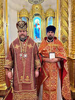 На малом входе, во внимание к усердным трудам и к празднику Святой Пасхи клирики епархии были удостоены богослужебно-иерархических наград: