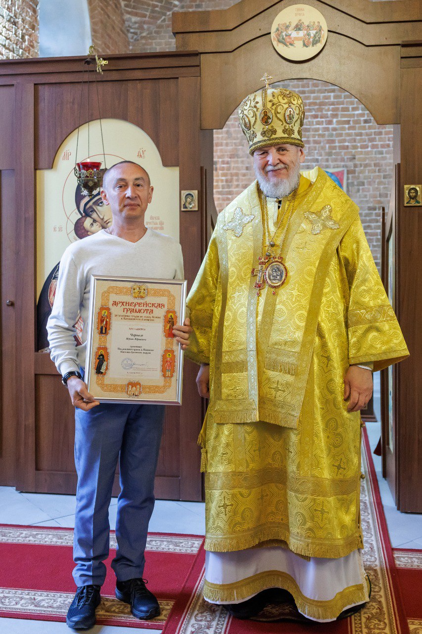По окончании Литургии Его Преосвященство обратился к сослужившему духовенству и молящимся с архипастырским словом и вручил Архиерейские грамоты Балашихинской епархии за усердные труды во славу Божию труженикам прихода А. М. Силакову и Ю. Ю. Чернеге.