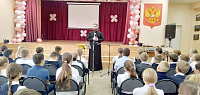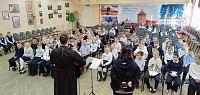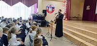 В ходе посещения отец Иоанн провел урок по основам православной культуры в 4-х классах. Во время урока ребята поговорили с батюшкой о вере, заповеди любви и жертвенном подвиге учителя.