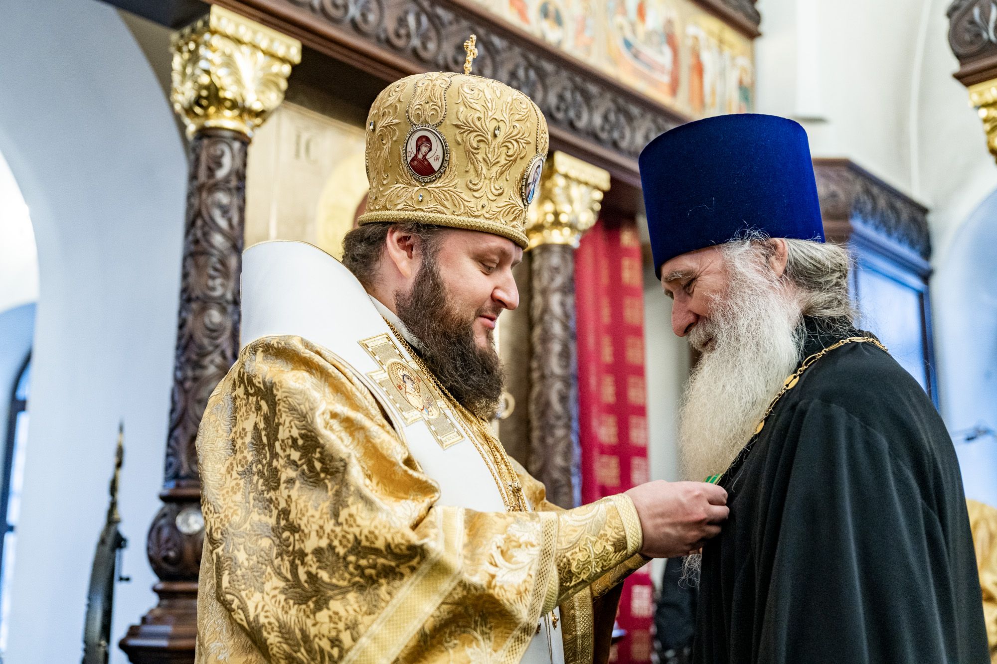 Затем владыка вручил настоятелю храма иконы Божией Матери «Нечаянная Радость» посёлка санатория «Подмосковье» г.о. Домодедово иерею Александру Королёву медаль преподобного Сергия Радонежского.