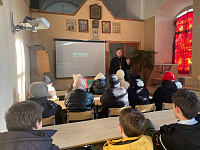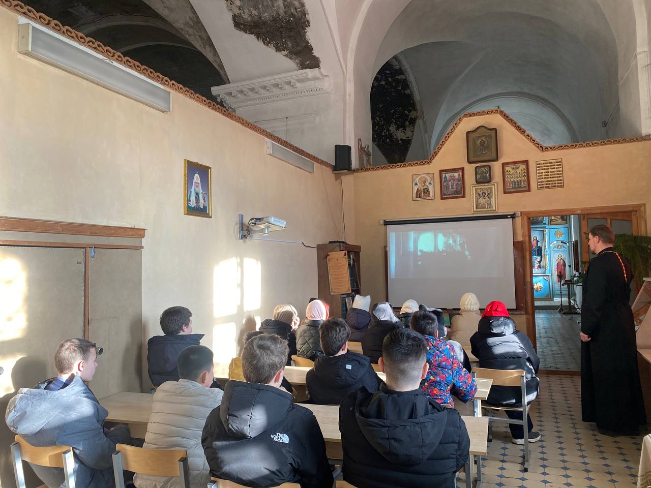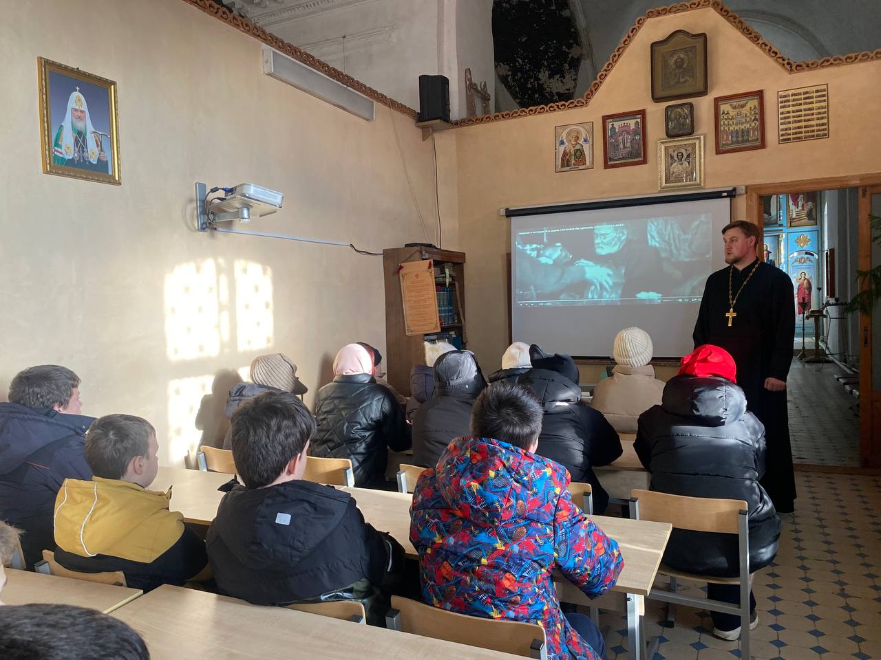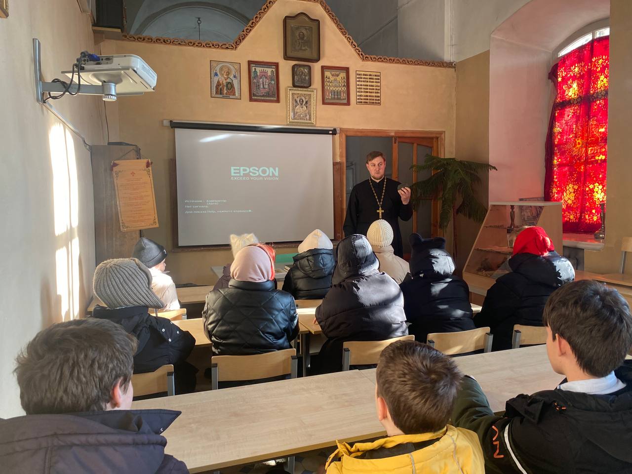 4 февраля Преображенский храм п. Белоомут посетили учащиеся 7-го класса Белоомутской СОШ №1. Благочинный 2-го Луховицкого округа иерей Владимир Келин провел урок, посвященный 100-летию со дня блаженной кончины Святителя Тихона Патриарха Московского и всея России. Отец Владимир показал детям фильм о гонениях на Русскую Православную Церковь в XX веке и о Патриархе Тихоне. Также вспомнили и о трагической истории Белоомутских храмов, которые были разграблены и порушены в те годы.