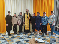 На освящении молились Суслова Мария Андреевна, старший воспитатель детского сада «Незабудка» МБОУ школы №7 и воспитательский коллектив. После освящения отец Николай обратился к сотрудником с проповедью о благословенном служении, которое совершают воспитатели, закладывая зёрна добродетелей и нравственности в наших детях.