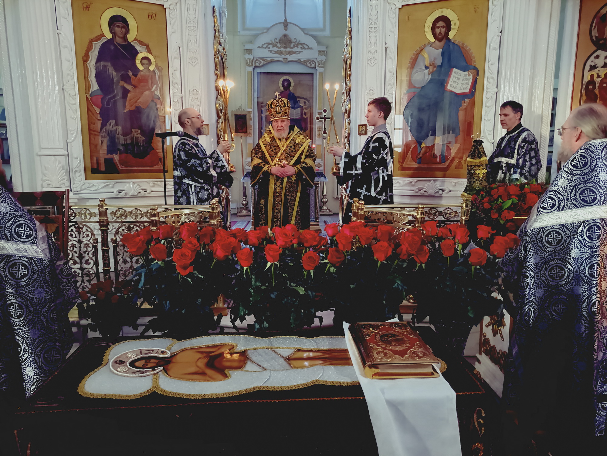 В этот же день вечером в Преображенском соборе владыка Николай совершил утреню Великой Субботы с чином погребения плащаницы.