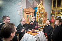 Проповедь по запричастном стихе произнёс заведующий кафедрой библеистики Московской духовной академии протоиерей Олег Мумриков.