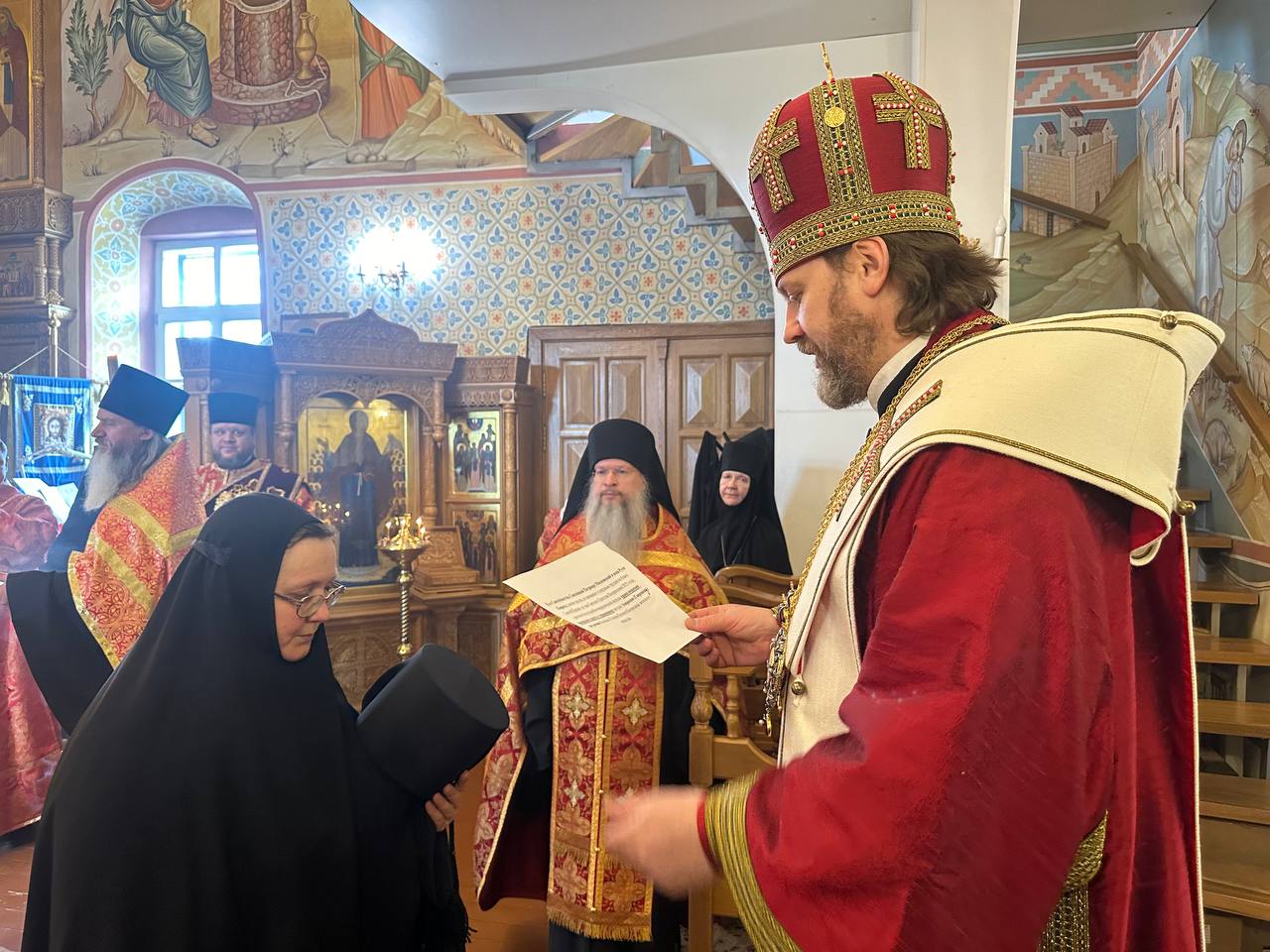 После шестой песни канона Владыка вручил настоятельнице монастыря, игумении Амвросии (Гавриневой) награду — наперсный крест с украшениями.