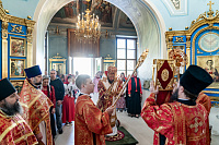 Его Высокопреосвященству сослужили секретарь Подольского епархиального управления иерей Константин Семёнов, настоятель подворья, казначей монастыря иеромонах Артемий (Подмосковный) и насельник обители иеромонах Гурий (Карпов). Диаконский чин возглавил иеродиакон Давид (Папирник).