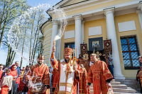 Далее было совершено освящение воды перед иконой Божией Матери «Живоносный Источник» и прошёл крестный ход вокруг храма. Затем на святом источнике преподобного Давида Серпуховского был совершён чин освящения воды.