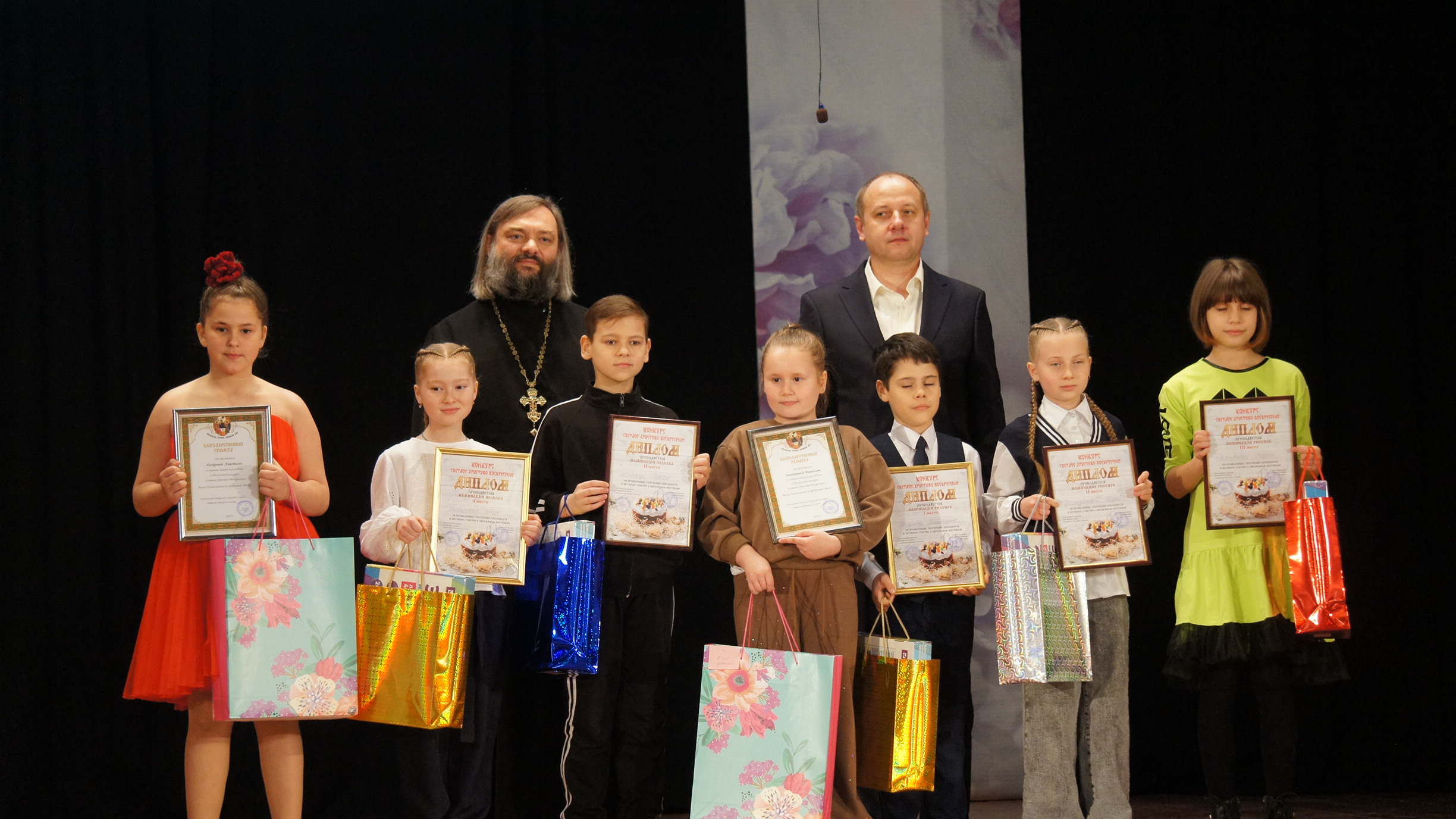 26 апреля в ДК Ленина г. Кашира состоялось торжественное награждение победителей творческого конкурса «Светлое Христово Воскресенье». Благочинный Каширского округа священник Валерий Сосковец вручил памятные подарки за лучшие работы. Силами воспитанников воскресных школ Введенского и Вознесенского храма г. Кашира были поставлены театрализованные представления пасхальной тематики. Все участники получили пасхальные куличи.