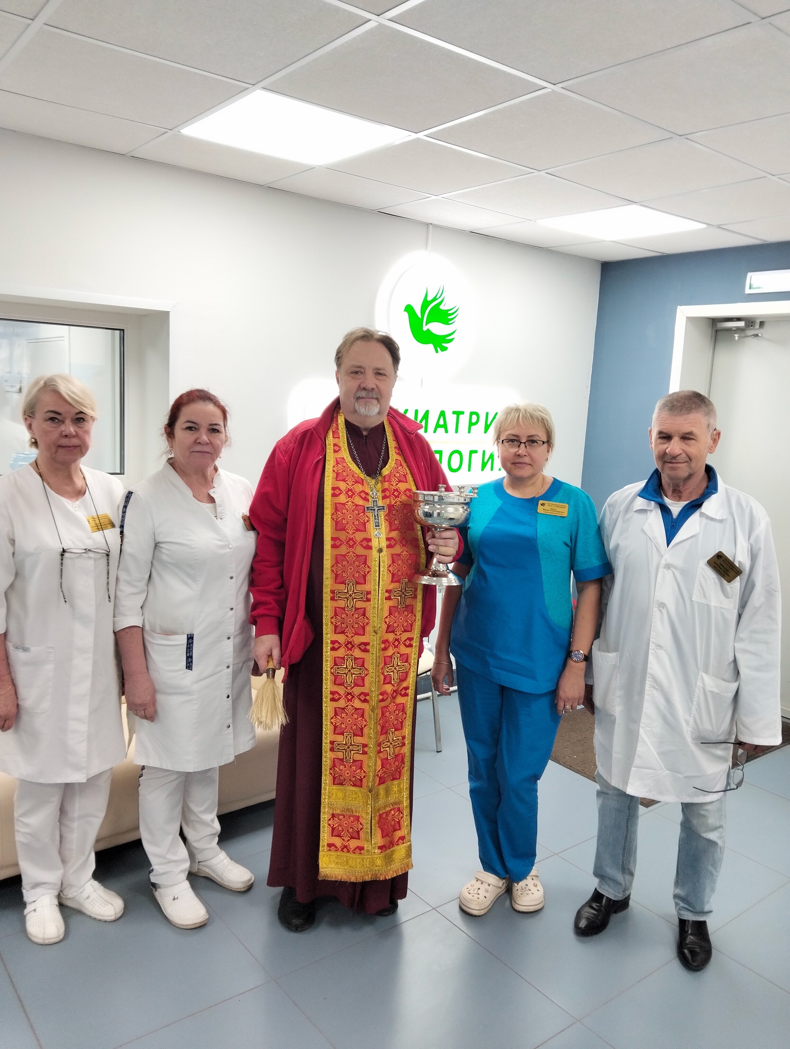 24 апреля 2025 г. в четверг Светлой седмицы, настоятель Никитского храма г. Коломны протоиерей Александр Чиков посетил диспансер психиатрической больницы №3 им. Т.Б. Дмитриевой, провёл беседу с персоналом, окропил помещения святой водой.