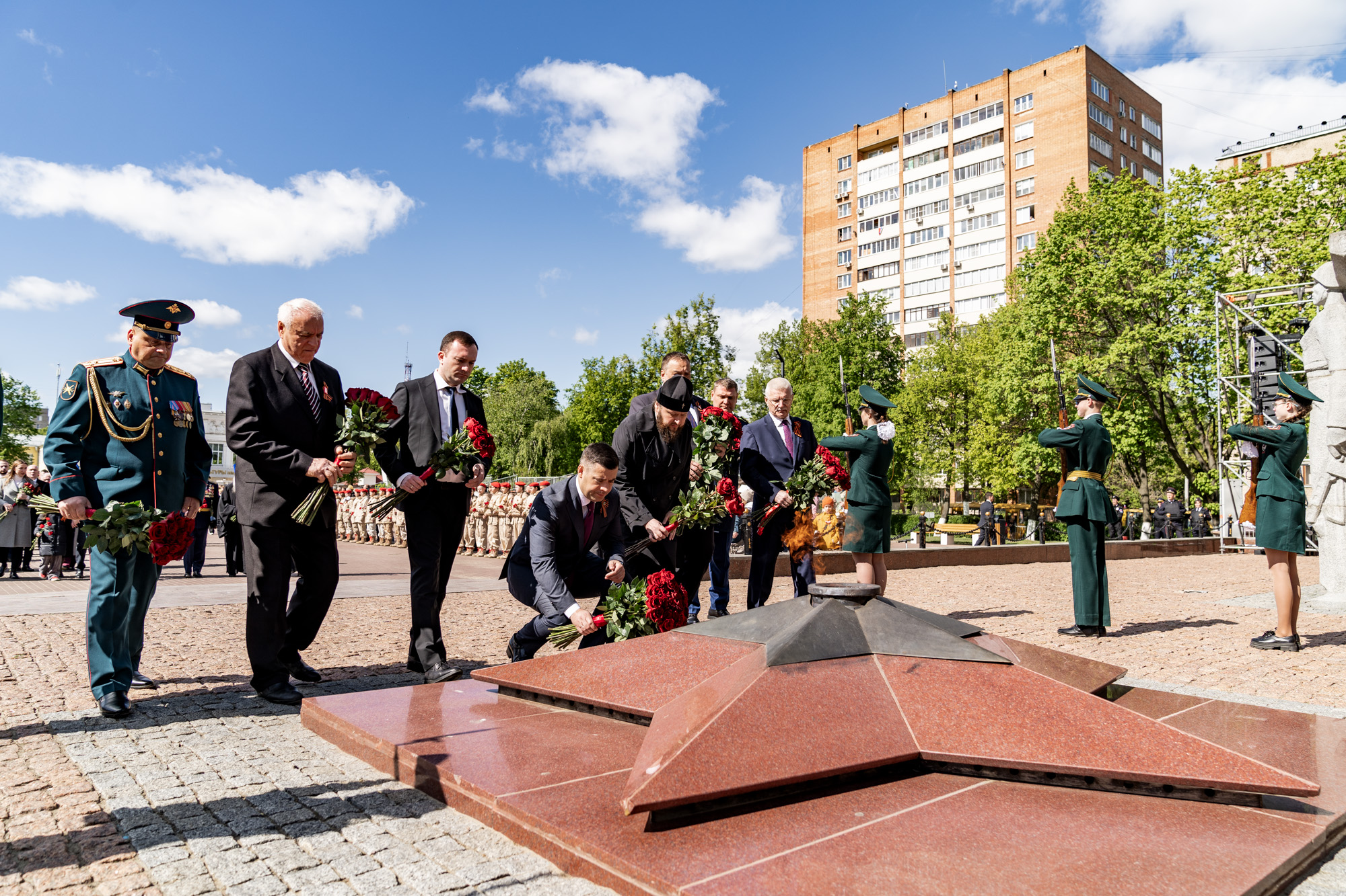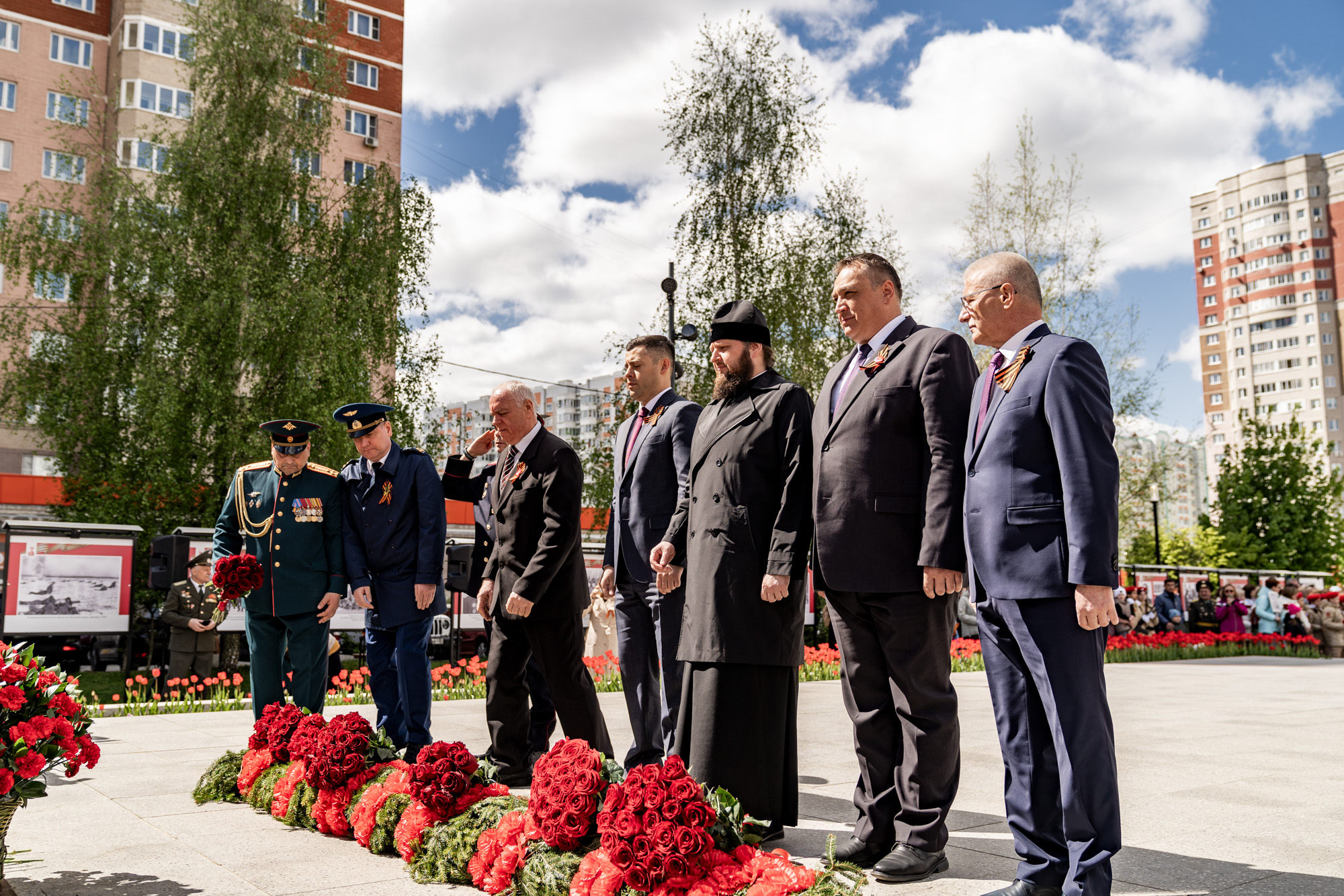 9 мая, в День Великой Победы, в Подольске прошло возложение цветов к мемориалам воинской доблести и славы. Участие в мероприятиях приняли ветераны, юнармейцы, представители трудовых коллективов и общественных организаций. Архиепископ Подольский и Люберецкий Аксий и глава г.о. Подольск Г.И. Артамонов возложили цветы к Вечному огню на площади Славы, памятникам воинам-интернационалистам и Подольским курсантам, а также к стеле «Населённый пункт воинской доблести». Также почтить память героев Великой Отечественной войны пришёл благочинный Подольского церковного иерей Серафим Покатилов.