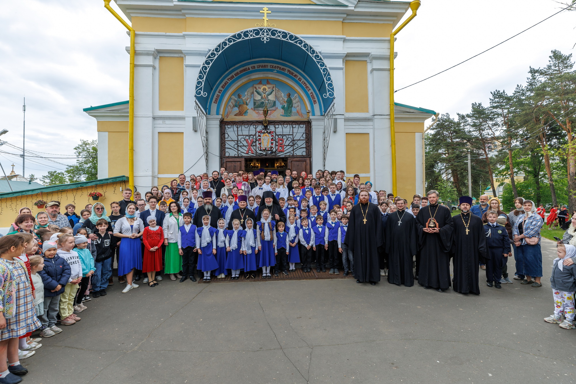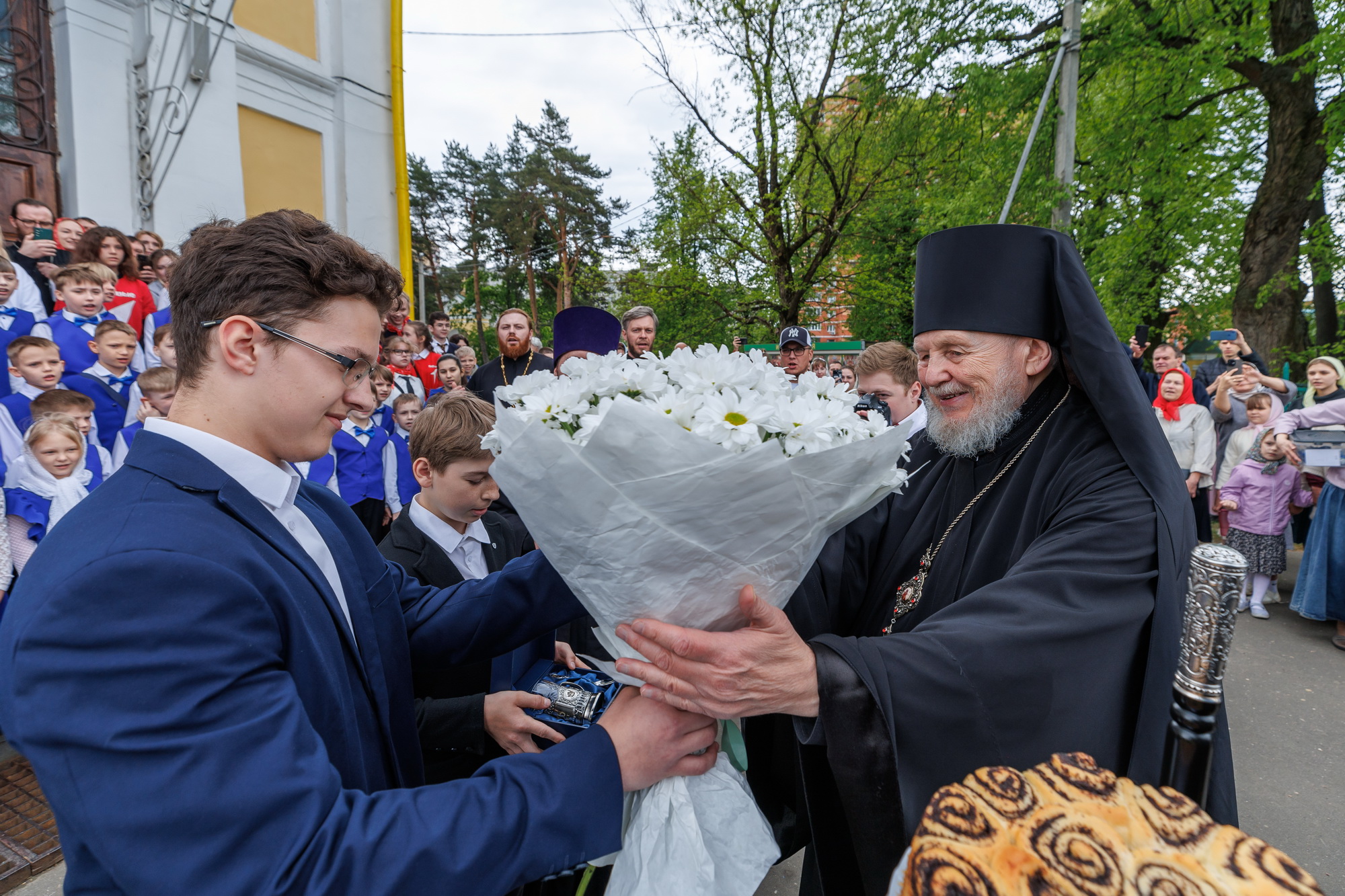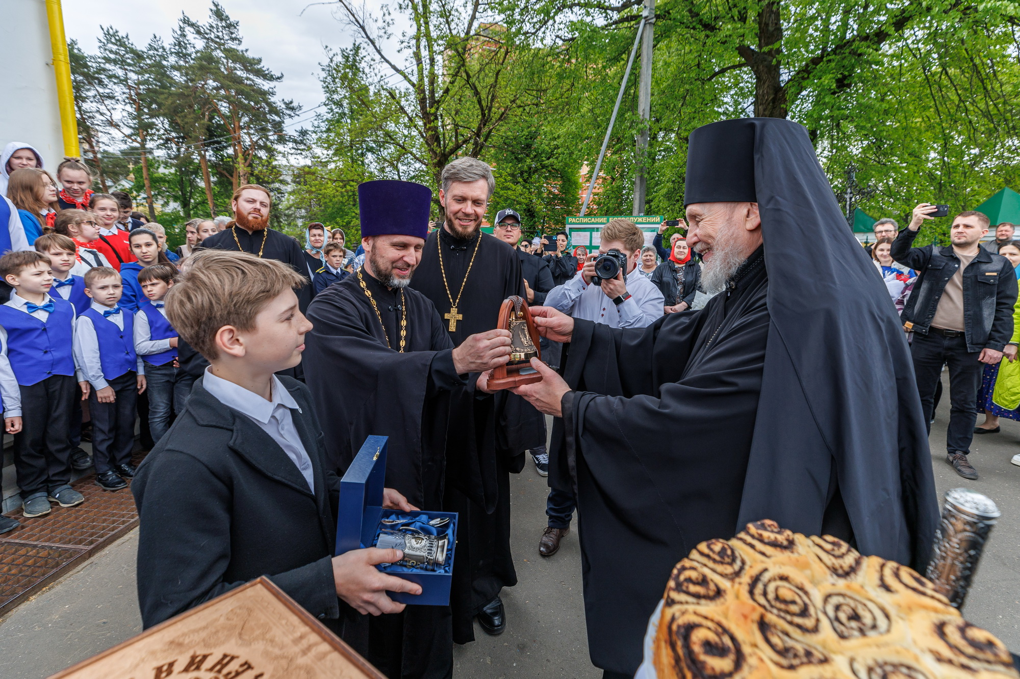 По окончании гуляний молодые люди Балашихинской епархии возгласом «Христос Воскресе» приветствовали прибывшего в Никольский храм епископа Николая, преподнесли ему каравай и памятные подарки.