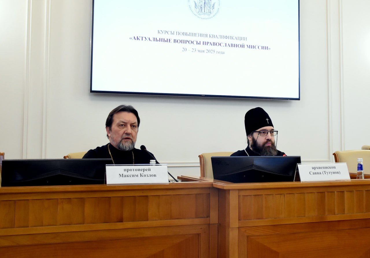 С 20 по 23 мая 2025 года в Общецерковной аспирантуре и докторантуре им. святых равноапостольных Кирилла и Мефодия прошли курсы повышения квалификации «Актуальные вопросы православной миссии», слушателями которых стали Председатель Отдела по миссионерской работе и делам молодёжи Коломенской епархии иерей Иоанн Бакушкин и благочинный 1-го Коломенского округа, секретарь Отдела по миссионерской работе и делам молодёжи Коломенской епархии протоиерей Алексий Виноградов. В рамках программы состоялись лекции и дискуссии, охватывающие целый ряд значимых, связанных с организацией миссионерской деятельности и актуальными вопросами православной миссии. В последний день обучения с заключительным словом к слушателям обратились председатель Синодального миссионерского отдела архиепископ Зеленоградский Савва и ректор Общецерковной аспирантуры и докторантуры протоиерей Максим Козлов.