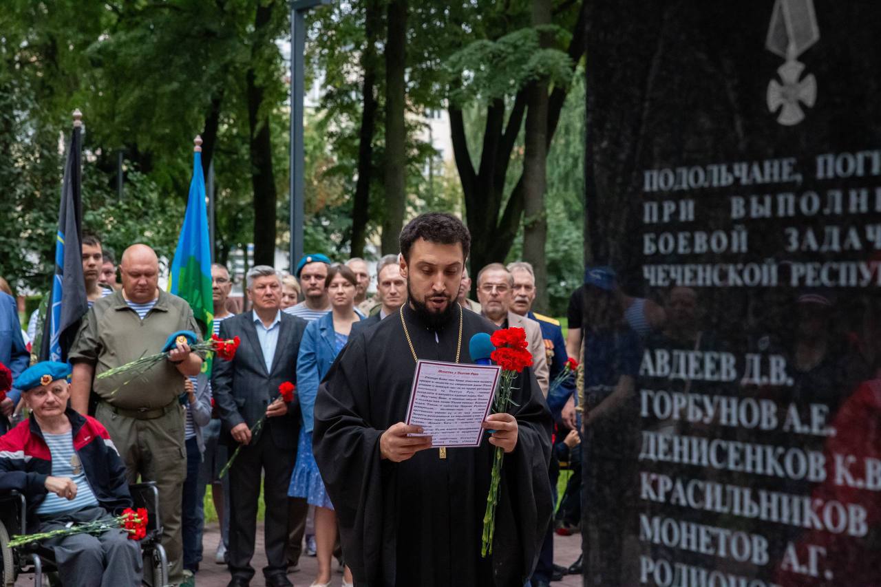 2 августа 2025 г., в день памяти пророка Божия Илии, благочинный церквей Подольского округа иерей Серафим Покатилов и председатель Комиссии по вопросам физической культуры и спорта Подольской епархии иерей Владимир Брагин приняли участие в торжественном мероприятии, посвящённом дню Воздушно-Десантных Войск, на котором присутствовали: представители Администрации, руководители и участники общественных объединений, участники СВО, руководитель Подольского отделения Ассоциации ветеранов СВО Московской области Игорь Науменков, председатель Общественной палаты Евгений Патрушев, ветераны боевых действий, молодёжь, жители г.о. Подольск.
