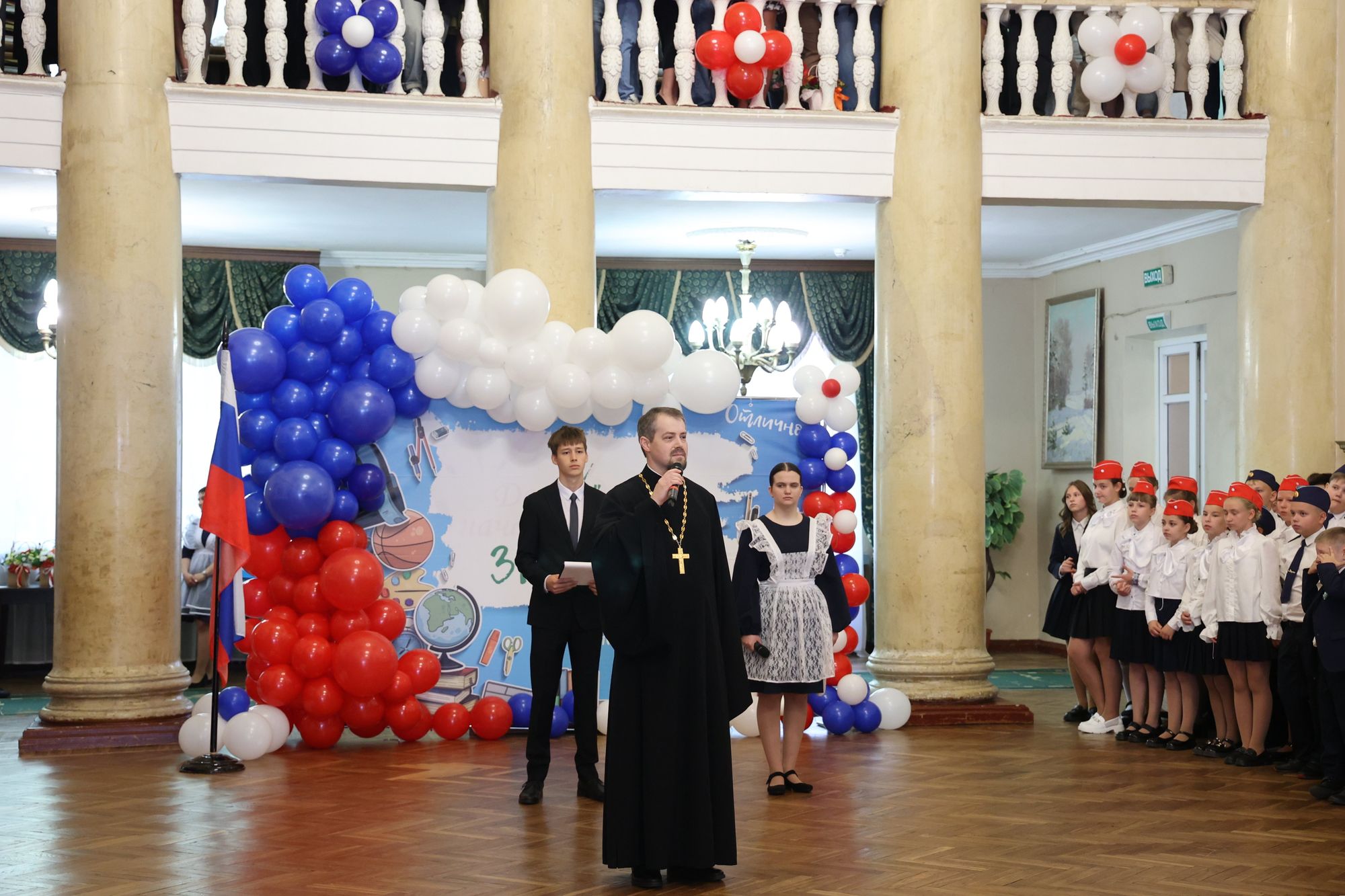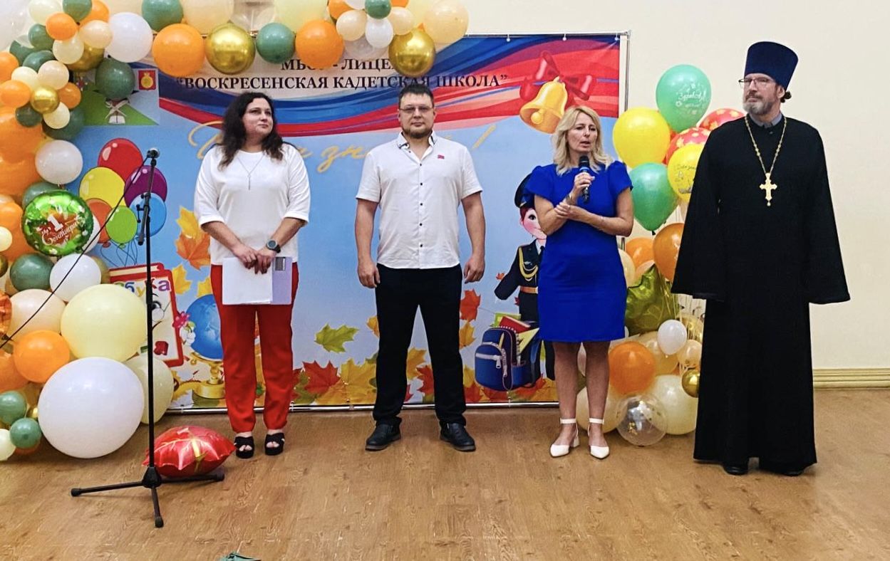 Клирик Иоанно-Златоустовского храма с. Новлянское протоиерей Сергий Вареников принял участие в праздничном мероприятии в МОУ СОШ «Горизонт». К обучающимся и педагогам также обратились начальник отдела финансового контроля Администрации городского округа Воскресенск О.В. Болотова, специалист Управления образования Администрации городского округа Воскресенск М.Г. Герасимова и депутат Совета депутатов городского округа Воскресенск И.В Донодин.