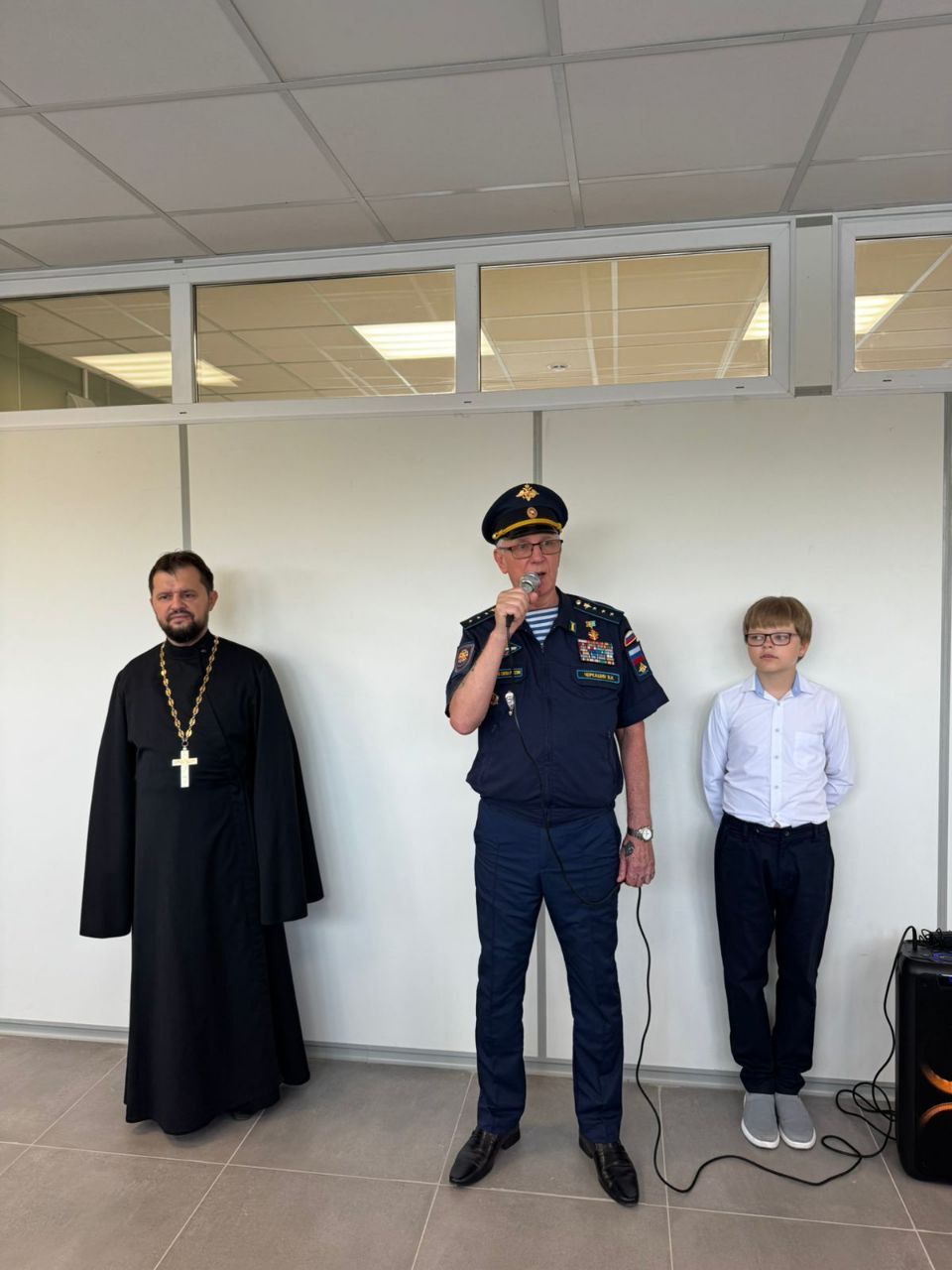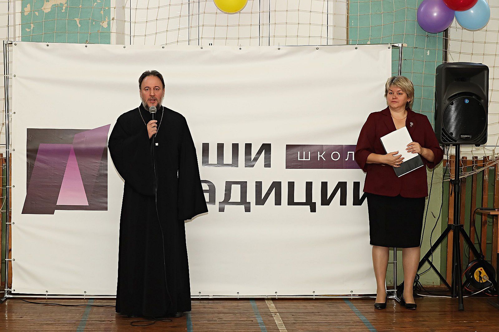 В учебном здании МОУ «СОШ «Наши традиции» (здание 3, п. Фосфоритный) мероприятие посетил настоятель Преображенского храма протоиерей Роман Ужастов.