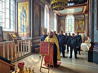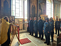 За богослужением молились сотрудники Зарайского пожарно-спасательного гарнизона и отдела надзорной деятельности и профилактической работы по м.о. Зарайск ГУ МЧС России по Московской области. На молебне была вознесена молитва «О Святой Руси».