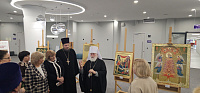 После окончания театрализованного урока митрополит Крутицкий и Коломенский Павел и первый заместитель министра образования Московской области А.В. Гребцова вместе с гостями мероприятия посетили выставку «Богословие в красках», подготовленную иконописной мастерской Государственного университета просвещения.