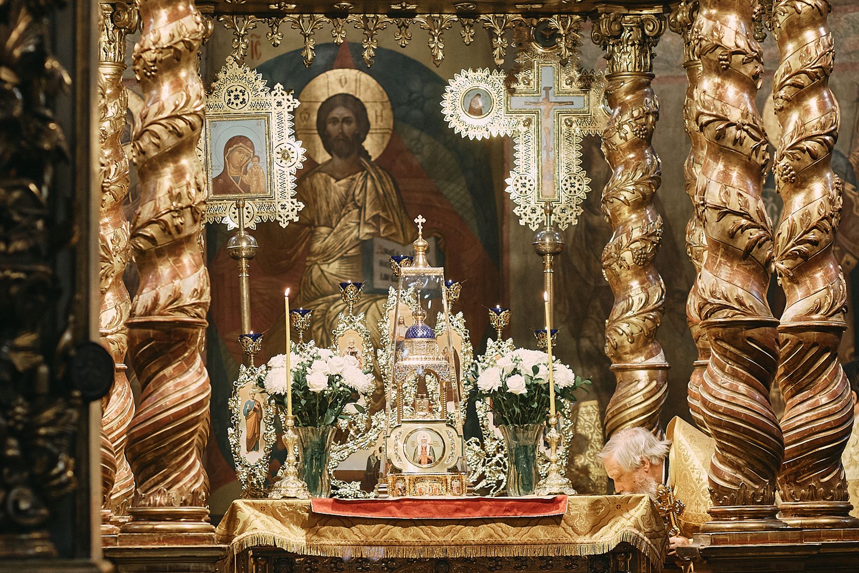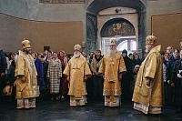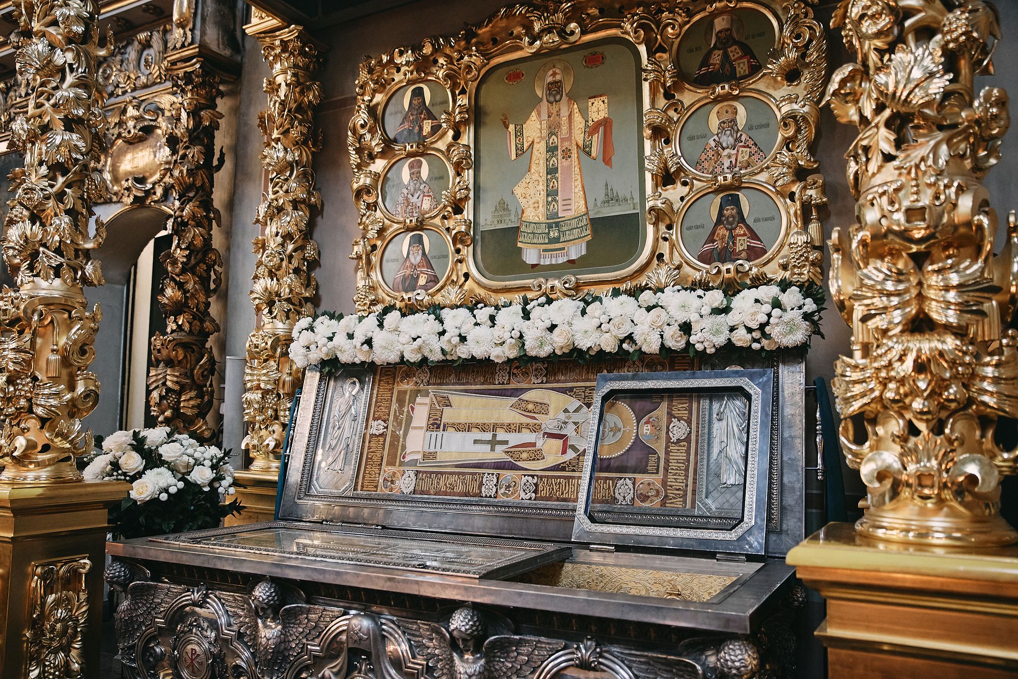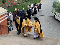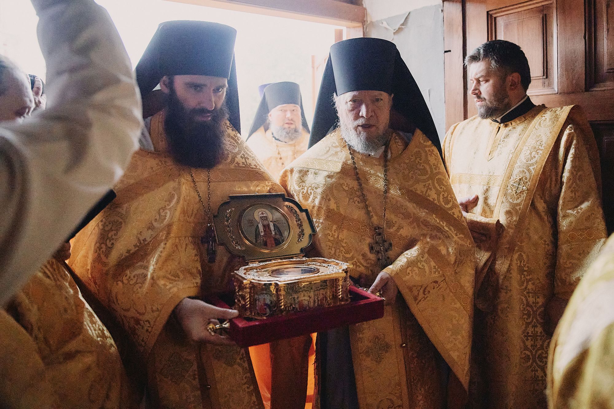 Перед богослужением у входа в собор состоялась встреча ковчега с частицей мощей святителя Тихона по завершении принесения его по епархиям Русской Православной Церкви.