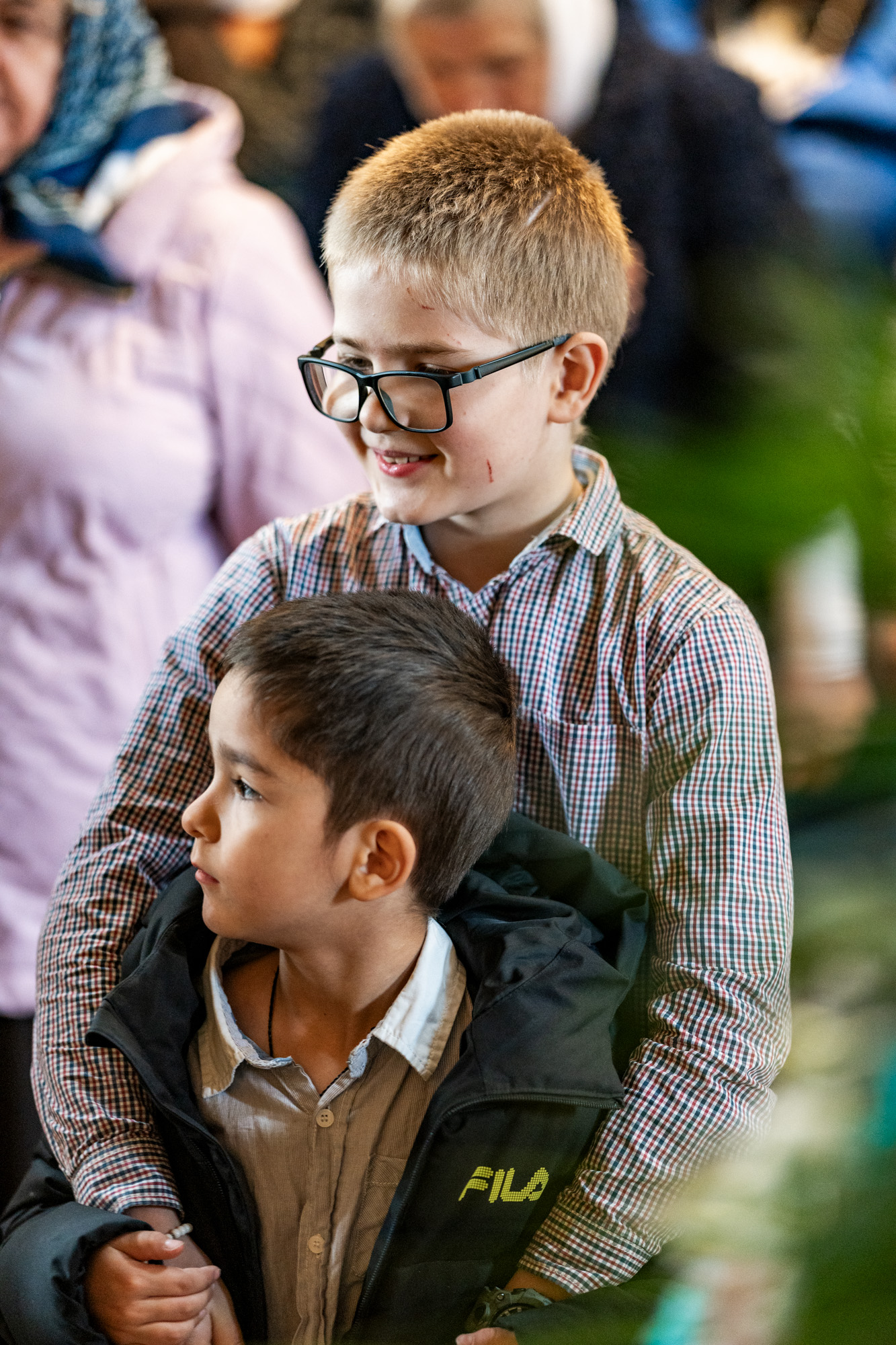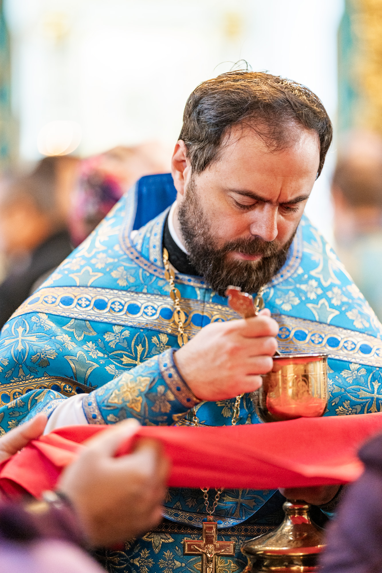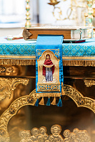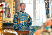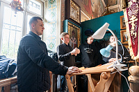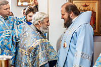 Далее настоятель храма протоиерей Марк Ганаба поблагодарил архиепископа Аксия за совершённое богослужение и преподнёс в дар малое архиерейское облачение (омофор).