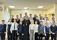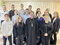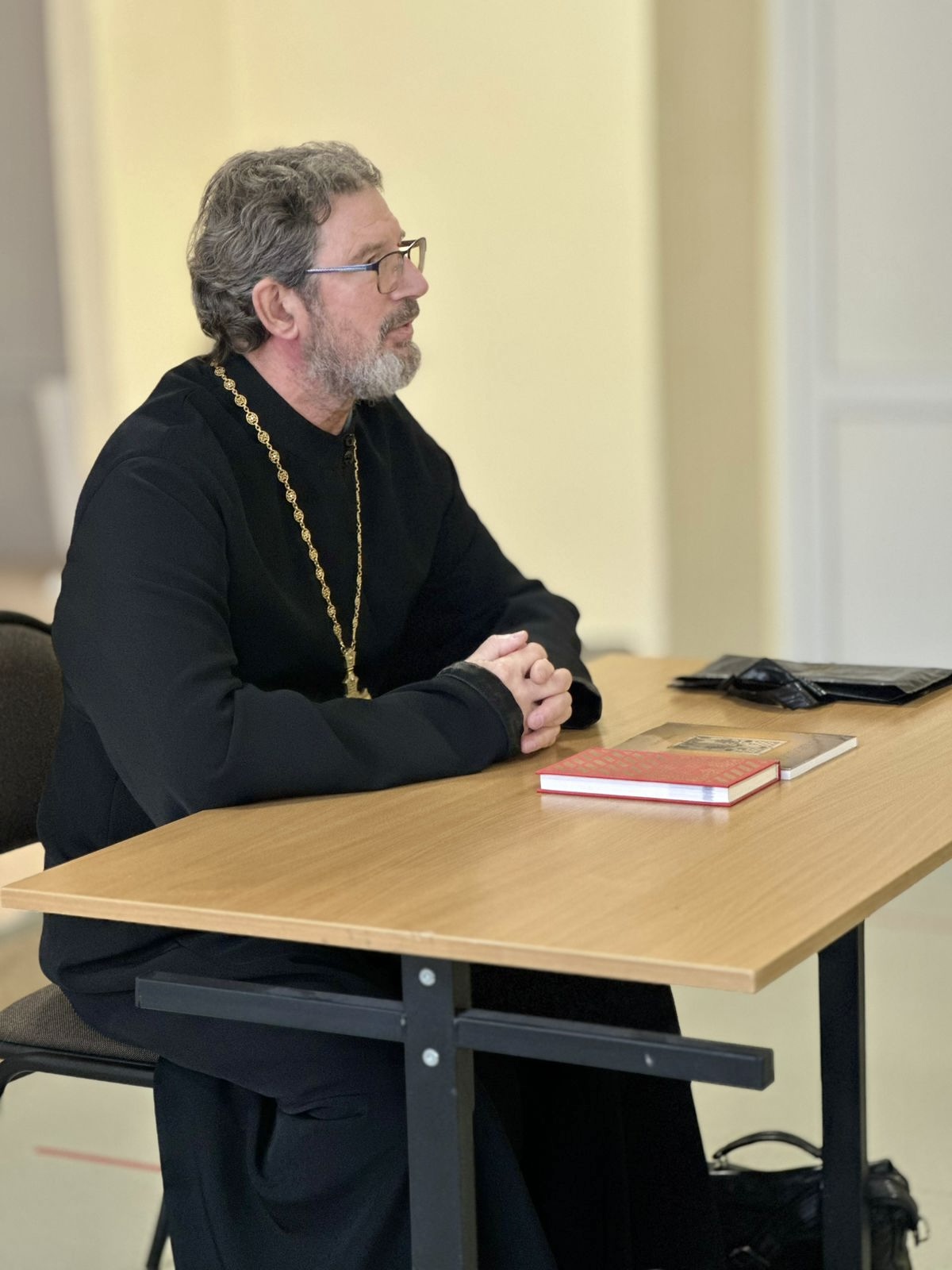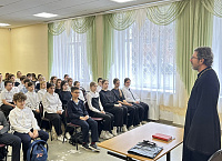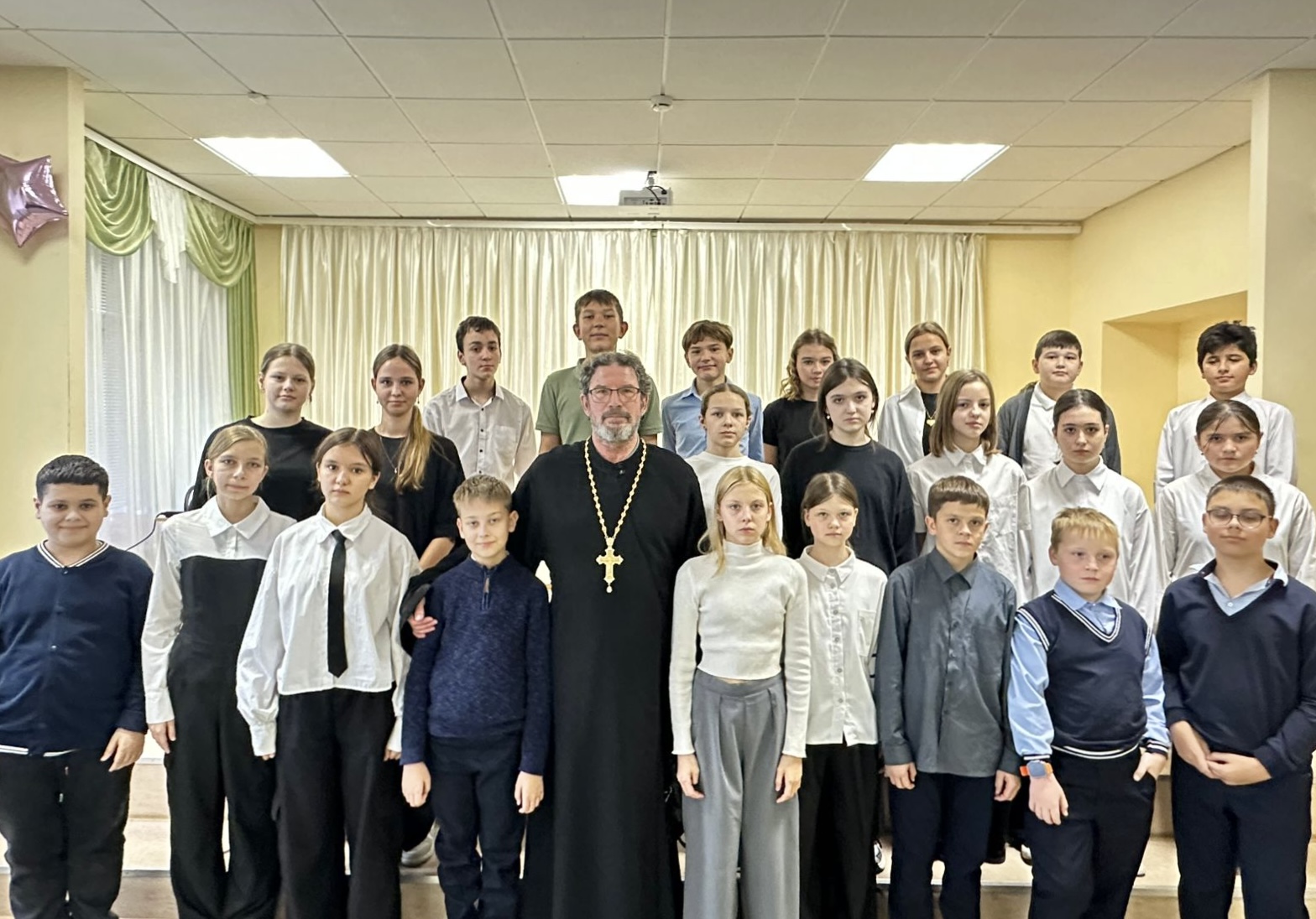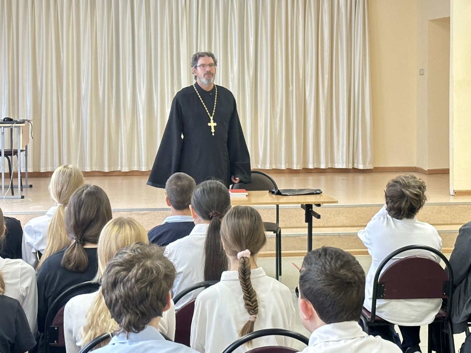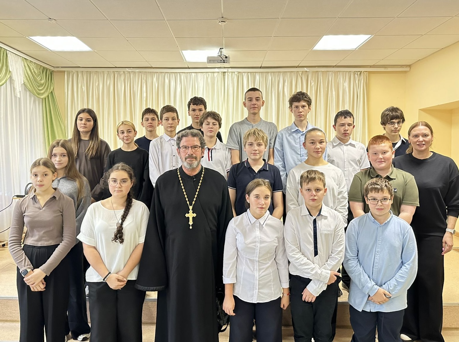 29 октября 2025 г. настоятель Казанского храма с. Ачкасово иерей Виктор Грачёв посетил МОУ «СОШ им. Героя России лётчика-испытателя Сергея Рыбникова» (здание 7) г. Воскресенска, где в рамках проекта «Задай вопрос священнику» встретился с учащимися 7‑х, 8‑х и 11‑х классов.