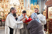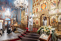 Далее архиепископ Аксий возложил цветы к Поклонному кресту, установленному на территории собора в 2013 году в память о всех пострадавших от безбожной власти в XX веке.