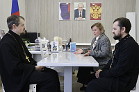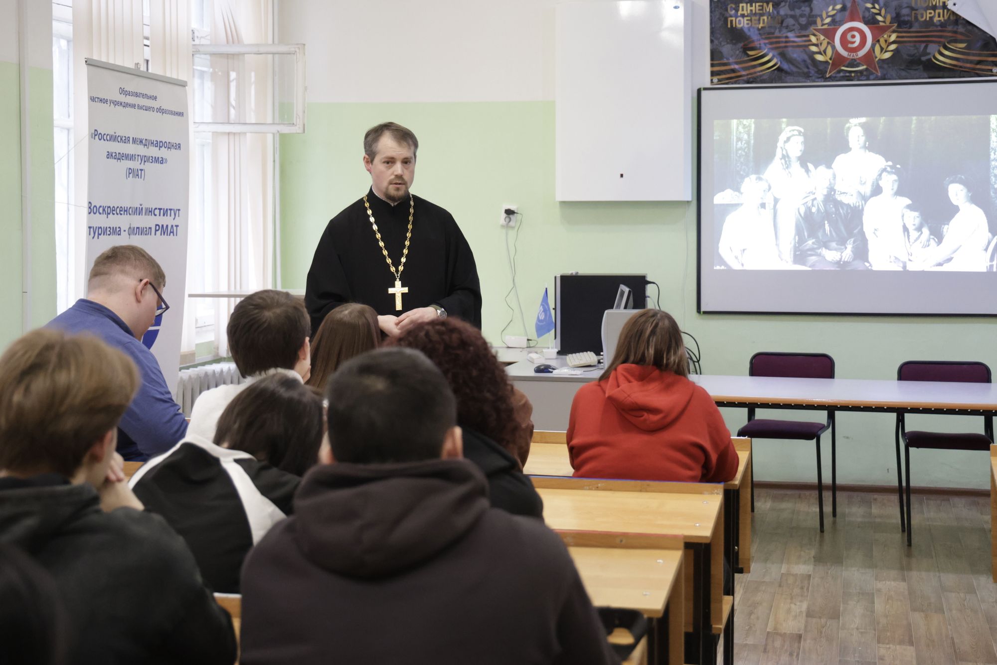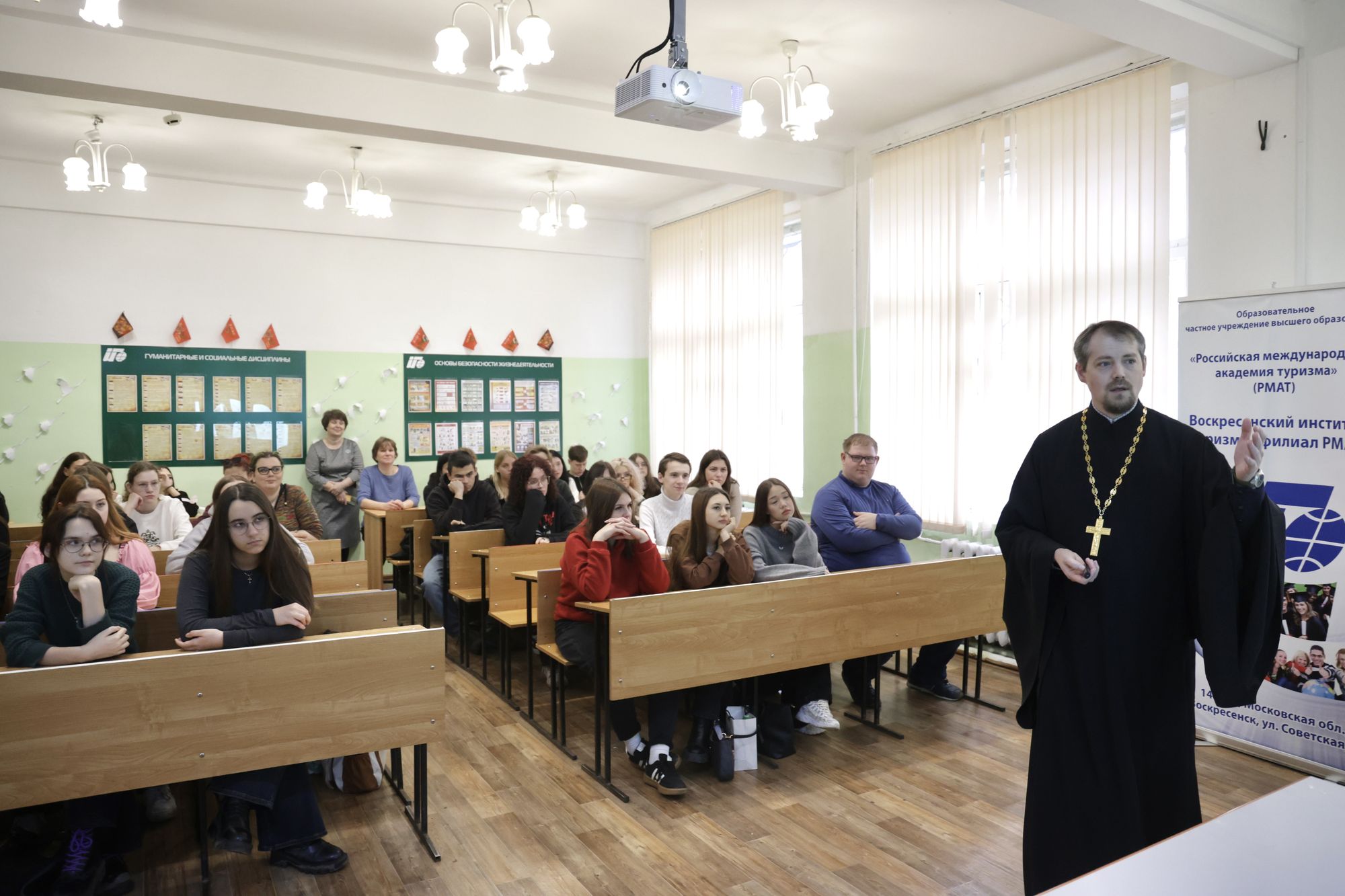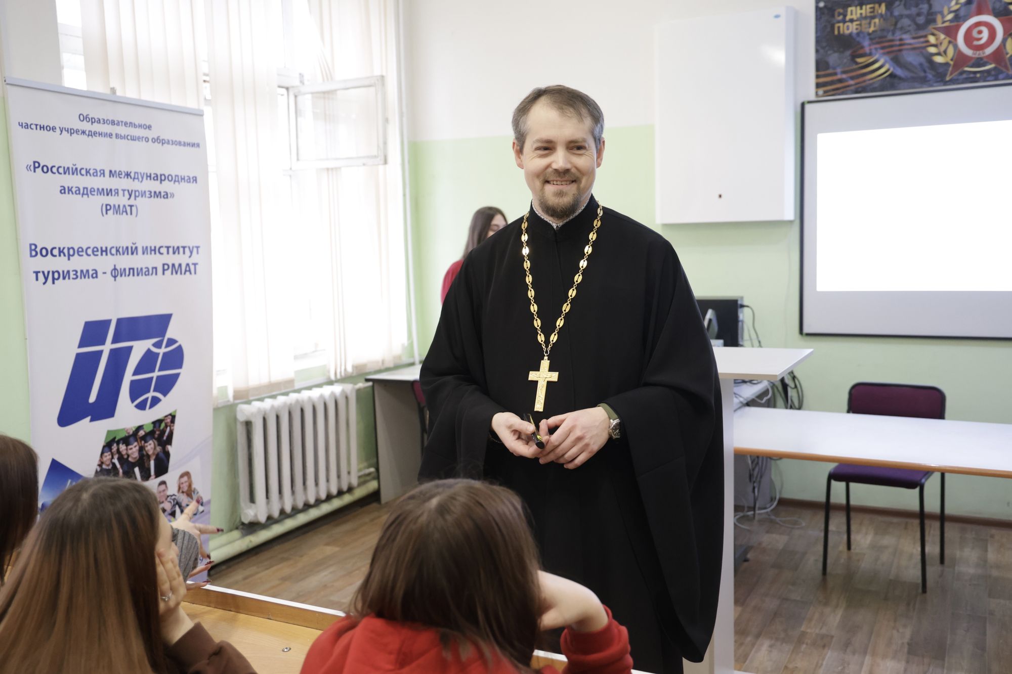 5 ноября 2025 г. благочинный 1-го Воскресенского благочиннического округа протоиерей Кирилл Седов и ответственный за миссионерскую работу и делам молодёжи в 1-м Воскресенском благочинническом округе протоиерей Андрей Безручко по приглашению заместителя директора по воспитательной работе И.В. Шершаковой посетили Воскресенский институт туризма – филиал Российской международной академии туризма. На встрече также присутствовала директор вуза Т.В. Квартальнова.