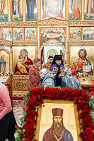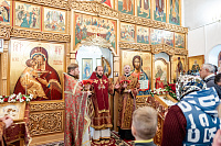 По заамвонной молитве было возглашено славление священномученику Николаю. Затем владыка совершил освящение мозаичных изображений, украшающих фасады храма.