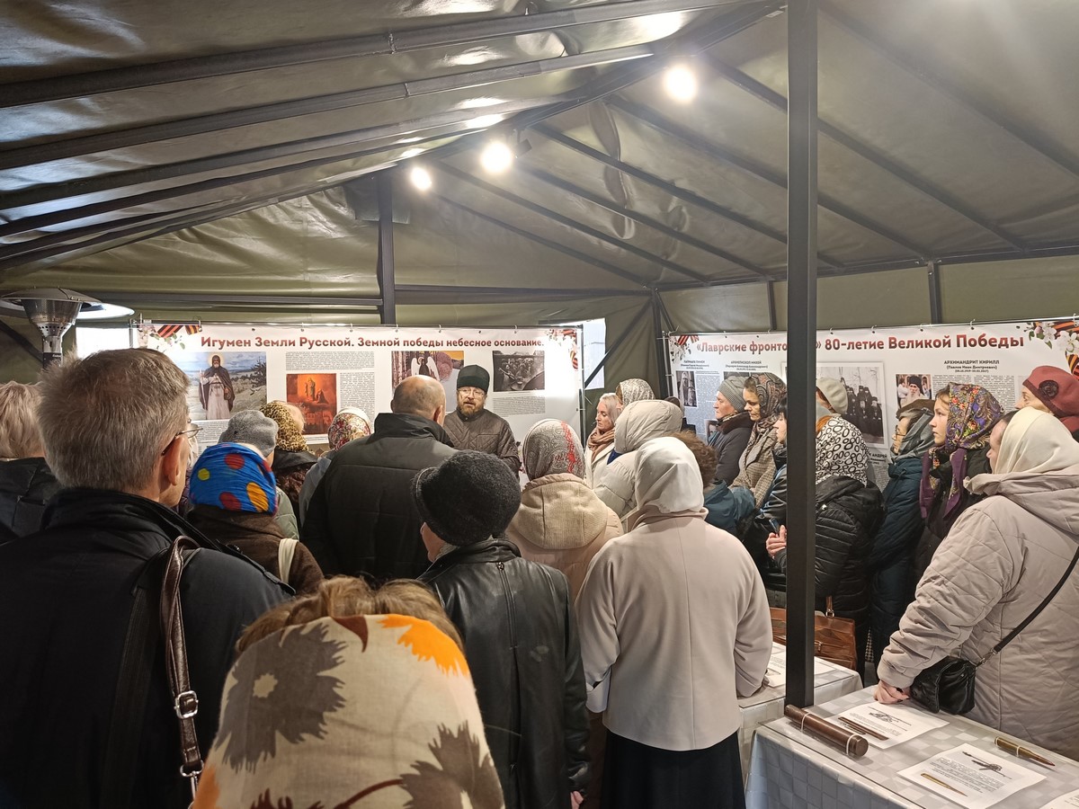 Затем участники посетили выставку «Значение подвига воинов 1-й Ударной армии. Лаврские фронтовики», организованную в воинской палатке на территории Сергиевского храма. На выставке участники прослушали рассказ о подвиге воинов 1-й Ударной армии, о Лаврских фронтовиках, о заступничестве преподобного Сергия Радонежского за наше Отечество в разное военное время и его роли в Победе в Великой Отечественной войне. На выставке были также представлены артефакты времён Великой Отечественной войны, раскопанные поисковым отрядом «Память народа».