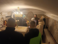 После чаепития паломники отправились в Свято-Троицкую Сергиеву лавру, где посетили святые места, приложились к честным мощам преподобного Сергия Радонежского. По благословению епископа Кирилла молебен у раки преподобного Сергия совершил секретарь владыки иеромонах Дамиан (Воронов). Архимандрит Василиск (Горбуль) и игумен Филипп (Ельшин) провели личные беседы и исповедовали желающих из числа семей участников СВО и ветеранов.