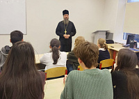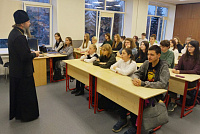 25 ноября настоятель Богородицерождественского храма протоиерей Владимир Пахачев в рамках открытых Рождественских чтений провел встречу со студентами 1 курса факультета иностранных языков ГСГУ. На встрече рассматривался вопрос христианского понимания ценностей и смысла жизни человека. В конце беседы отце Владимир ответил на вопросы студентов.