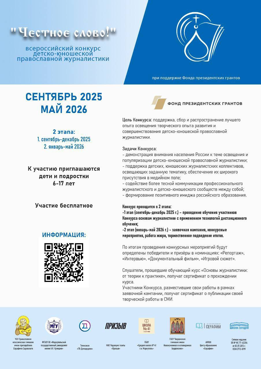 При поддержке Фонда президентских грантов с сентября 2025 года по май 2026 года проводится I Всероссийский конкурс детско-юношеской православной журналистики «Честное слово!», организованный ЧОУ «Православная классическая гимназия имени преподобного Серафима Саровского» города Домодедово.
