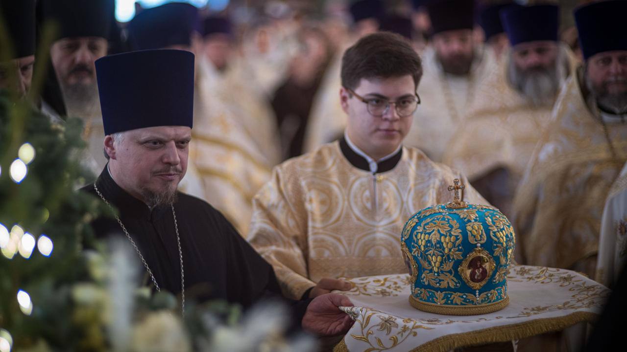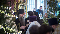 В завершение богослужения протоиерей Иоанн Монаршек поблагодарил Его Преосвященство за архипастырский визит и преподнёс на молитвенную память от прихода митру голубого цвета. От лица благочинных Сергиево-Посадской епархии отец Иоанн поздравил владыку с праздником Рождества Христова; епископу Кириллу был преподнесён архиерейский жезл.