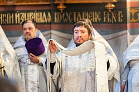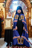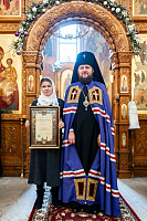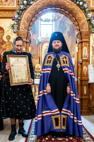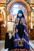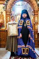 По окончании богослужения архиепископ Аксий обратился к молящимся с архипастырским словом и вручил медаль преподобного Варлаама Серпуховского III степени П.М.Ульянову, организатору паломнических поездок в Преображенском соборе Е.В.Лосевой, директору духовно-просветительского центра «Фавор и Ермон» Е.П.Новак и регенту собора М.В.Сидорычевой. Также владыка наградил архиерейскими грамотами за труды во благо Святой Церкви сотрудников Преображенского собора.