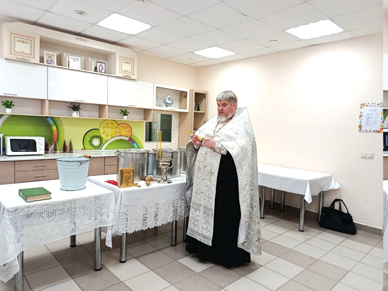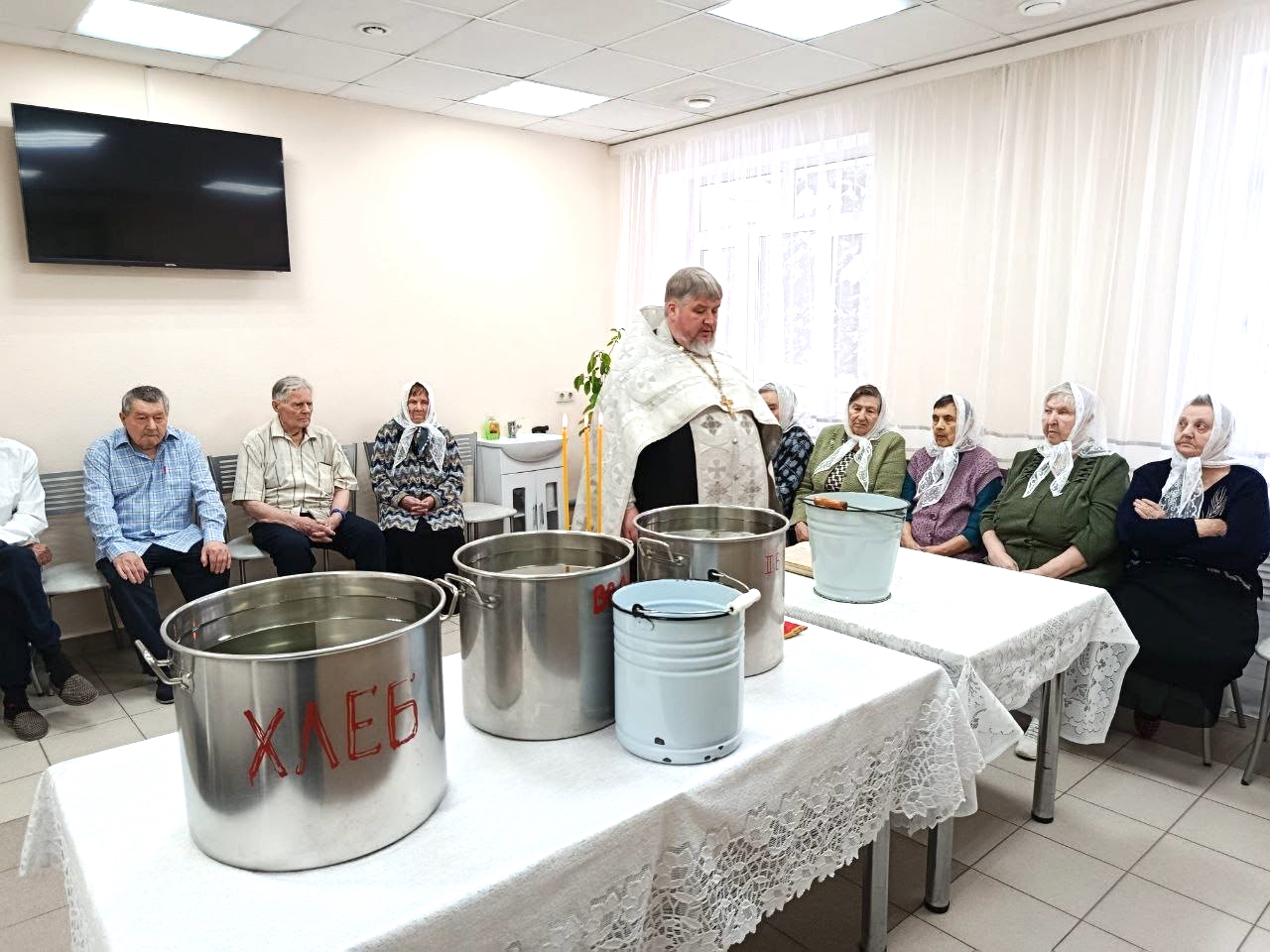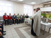 В ходе посещения отец Николай поздравил с праздником персонал, проживающих и пациентов, совершил чин великого освящения воды, окропил святой водой все помещения.