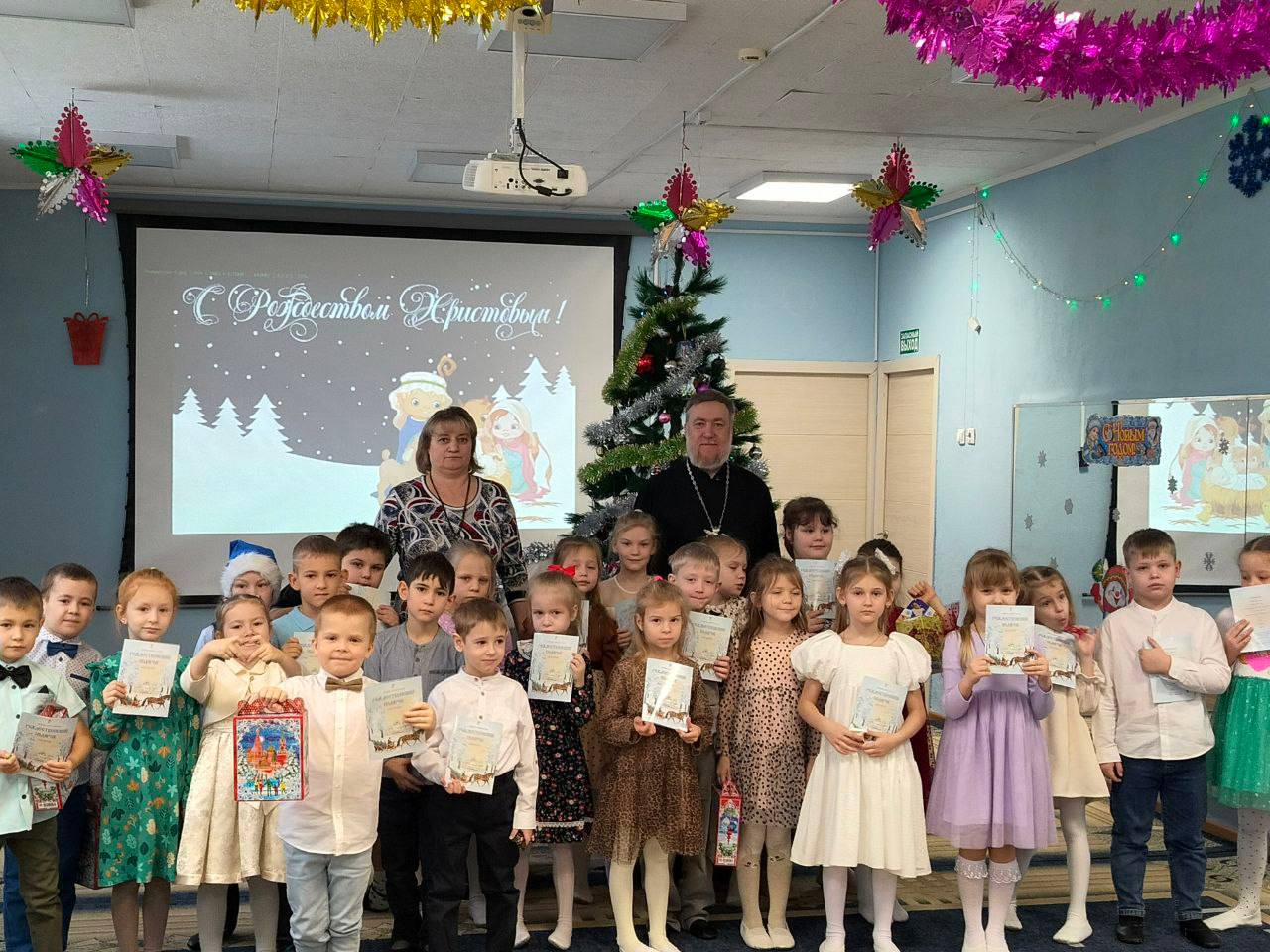 На праздниках отец Дионисий поздравил детей и воспитателей с праздником Рождества Христова и рассказал его историю. Дети выступили с подготовленными ими стихами и песнями, потом отвечали на вопросы викторины, которую проводил отец Дионисий. В конце праздника батюшка наградил детей, участвовавших в конкурсе на лучшую поделку, посвященную Рождеству Христову, и всем детям раздал подарки - книги о празднике Рождества Христова.