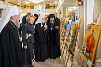 Святейший Патриарх Кирилл и В.И. Матвиенко осмотрели организованную в фойе первого этажа выставку детских рисунков «Красота Божьего мира».