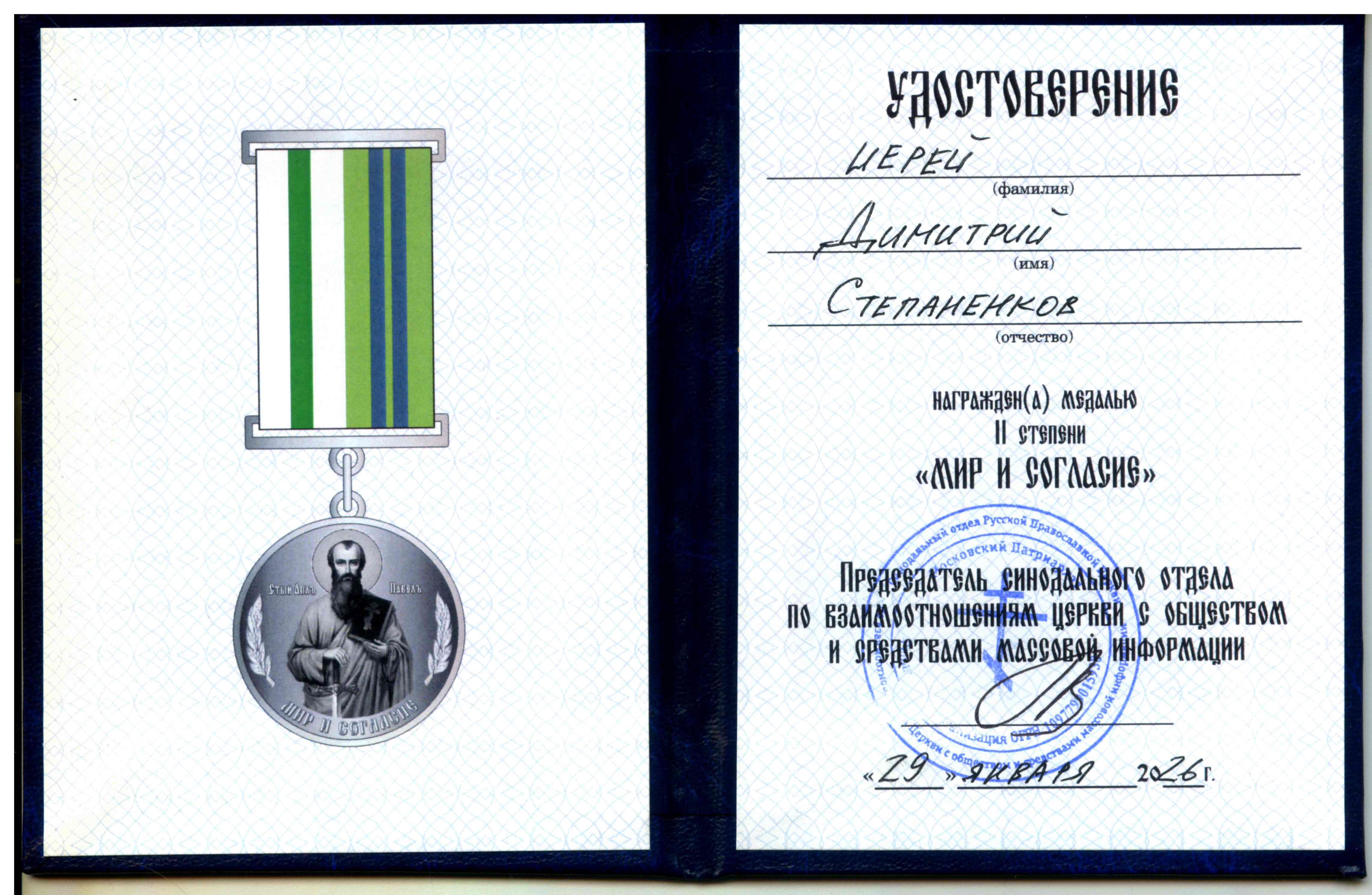 Пресс-секретарь Коломенской епархии, главный редактор сайта Московской митрополии иерей Димитрий Степаненков был награжден медалью означенного Синодального отдела "Мир и согласие" 2 степени.