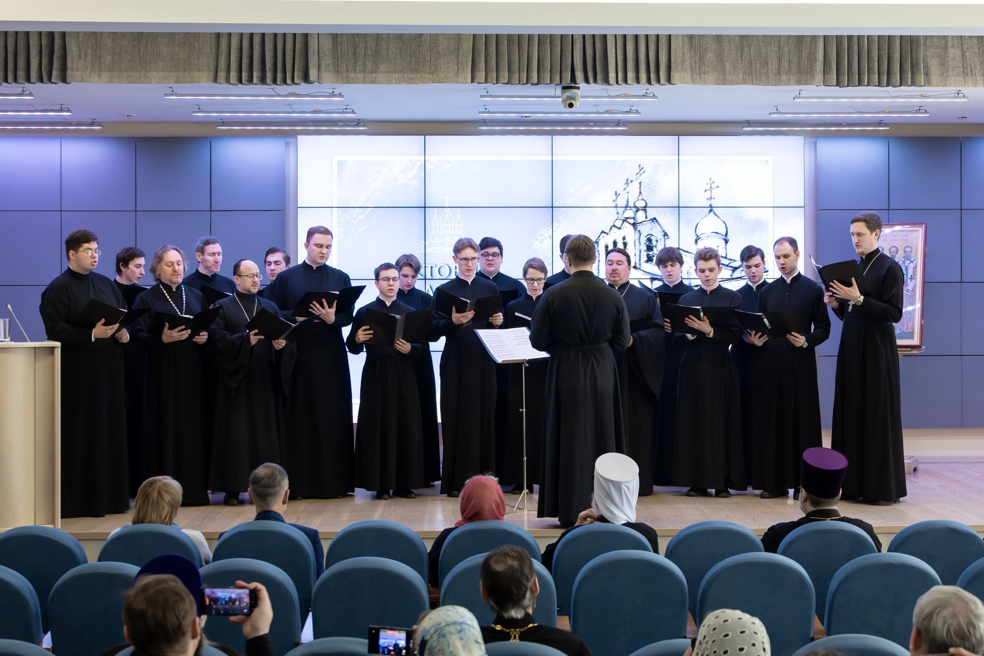 После богослужения в Актовом зале семинарии прошёл торжественный акт, завершившийся выступлением хора Коломенской духовной семинарии.