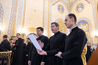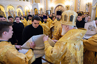 По заамвонной молитве митрополит Павел совершил поставление во чтецов студентов выпускного курса семинарии, после чего обратился к молящимся с архипастырским словом.