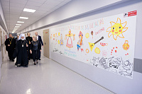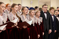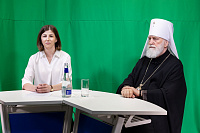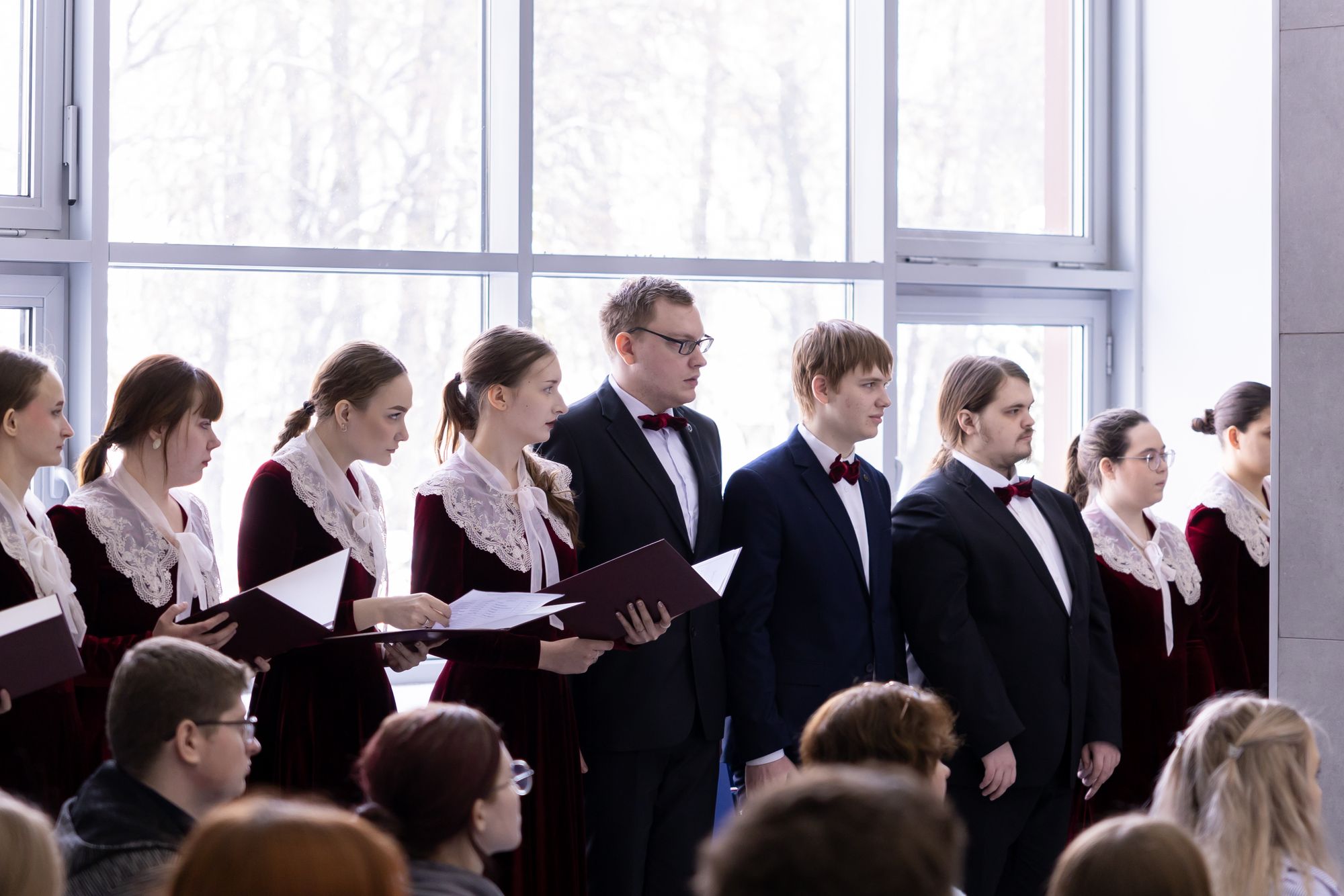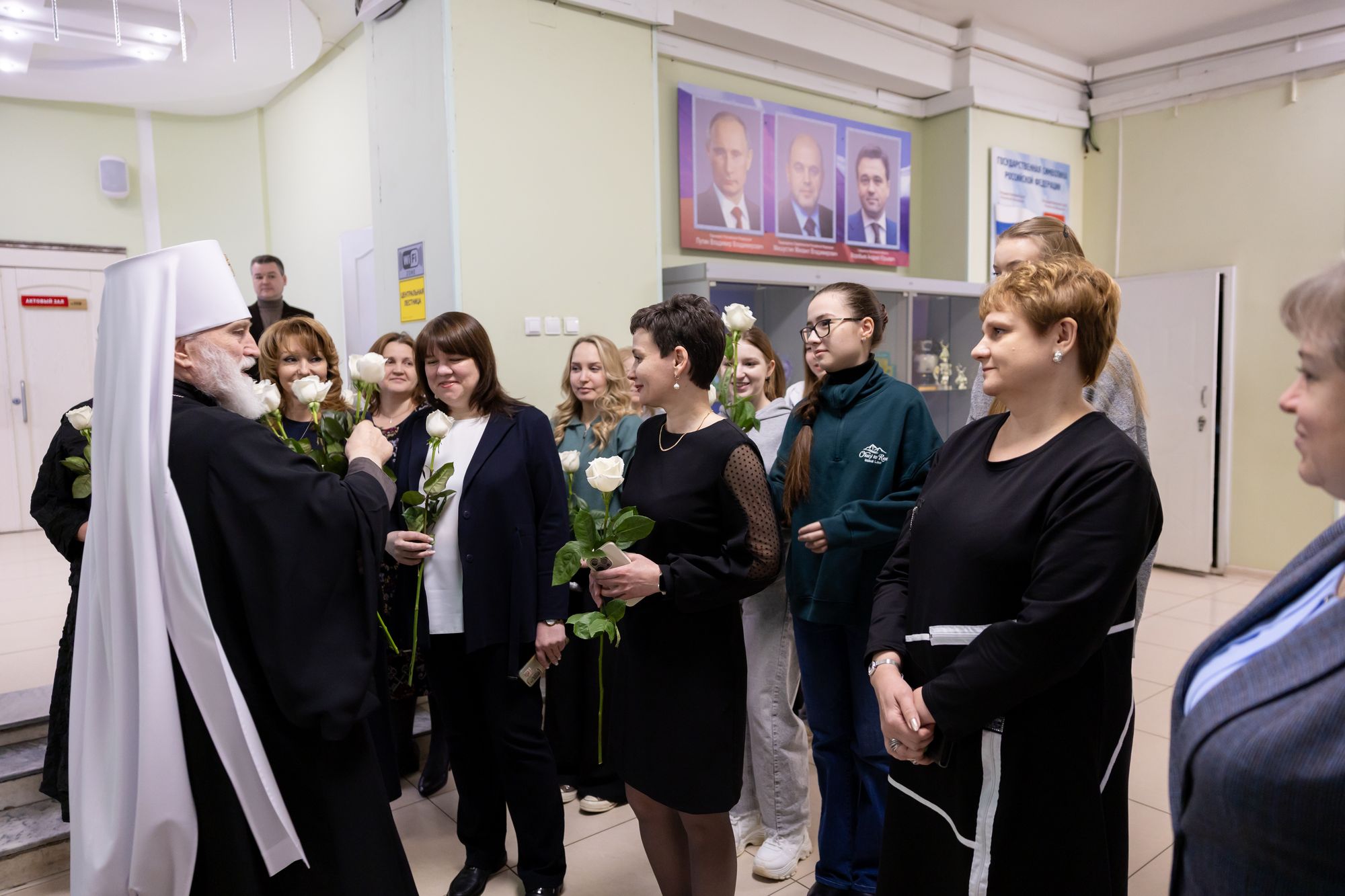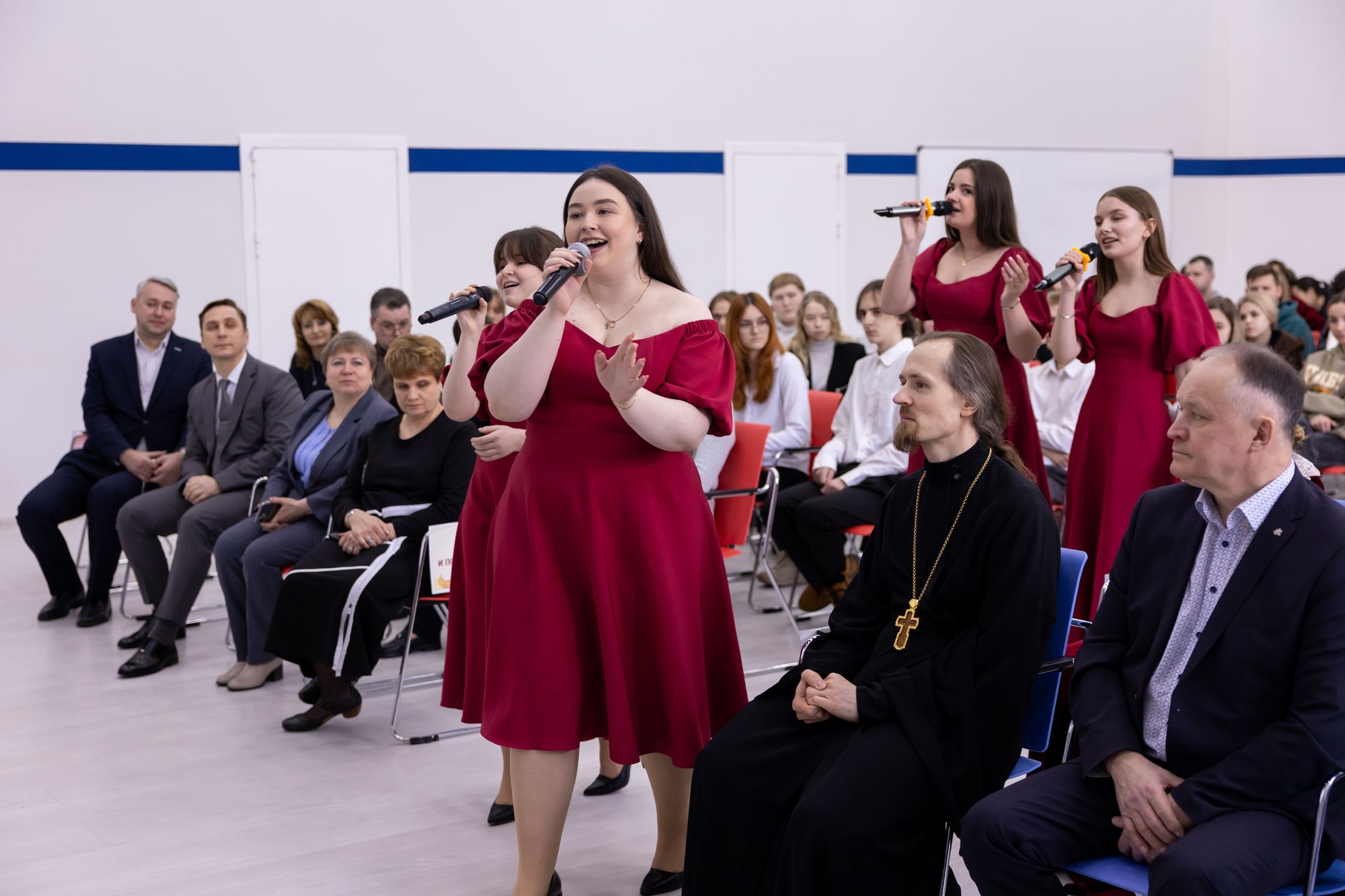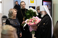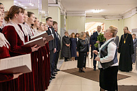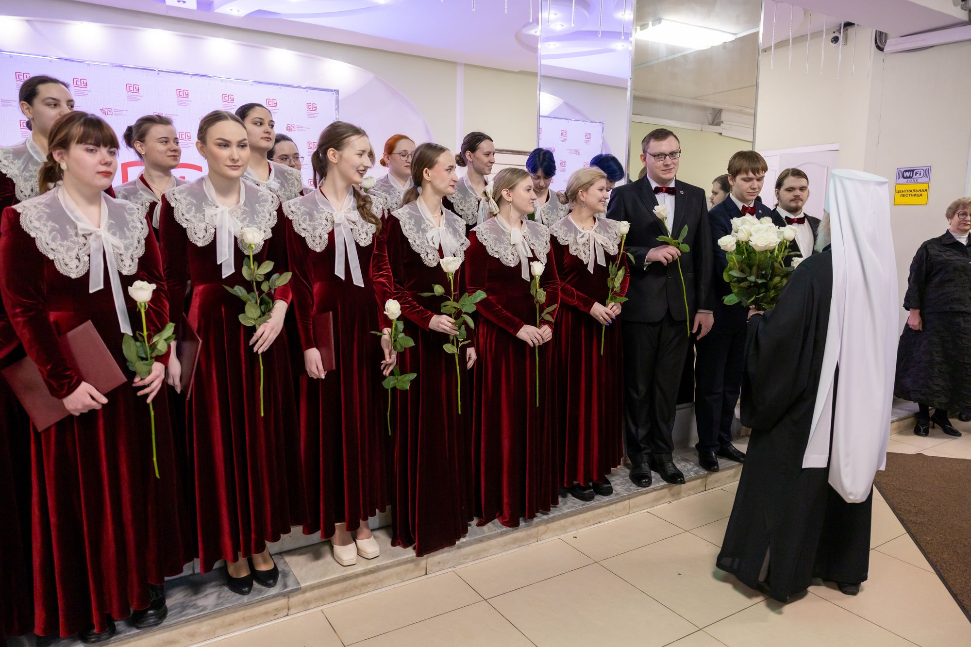 В фойе университета хор филологического факультета исполнил приветственную песню, после чего митрополит Павел принял участие в записи видеоролика в студии ГСГУ.