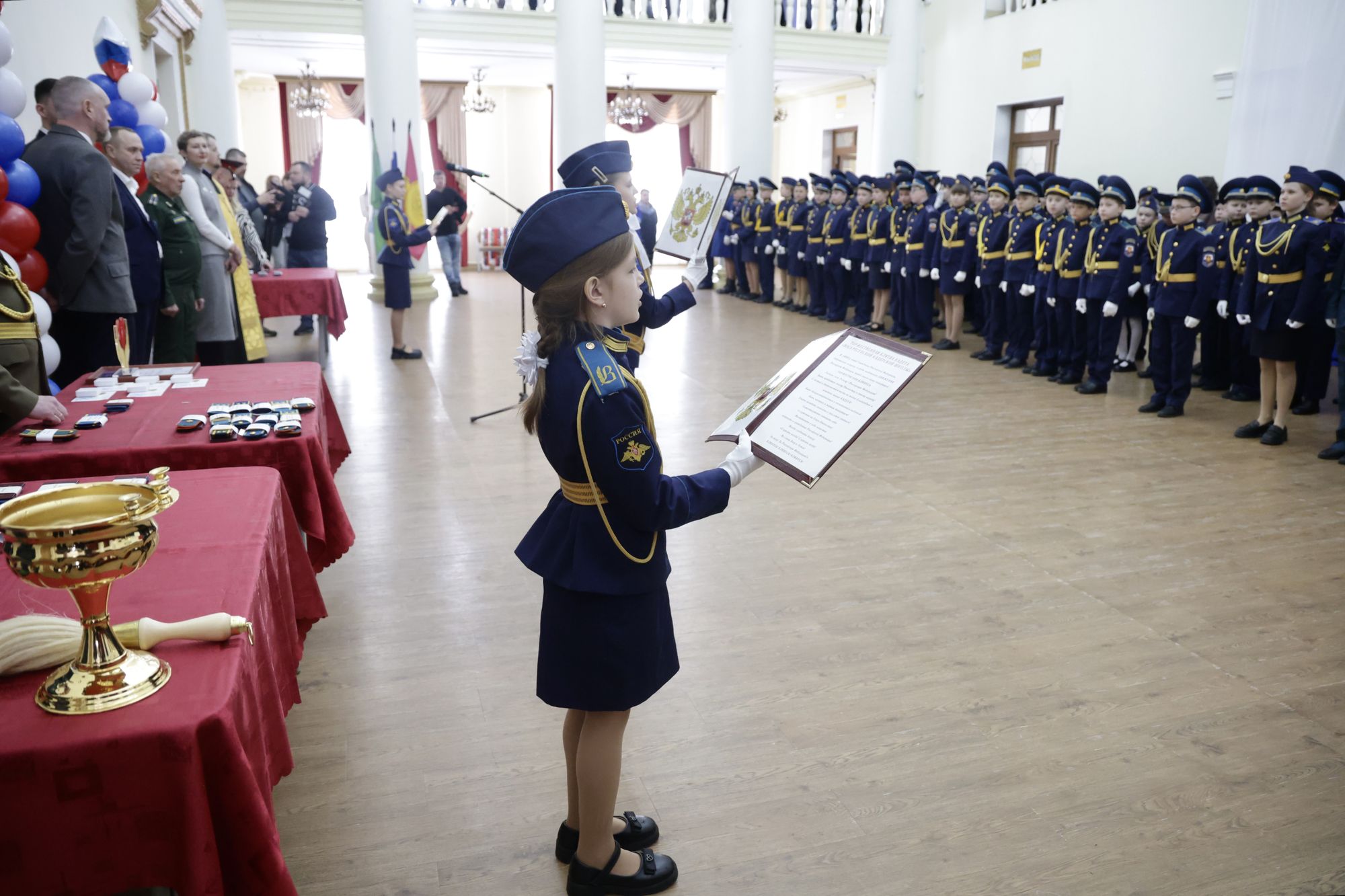 Церемония началась с внесения знамени и исполнения гимнов Российской Федерации и кадетской школы. Прежде чем произнести слова присяги, ребята успешно прошли серьёзные испытания – кадетскую сессию, включавшую 14 дисциплин: от огневой и строевой подготовки до истории России и следования кодексу чести кадета.