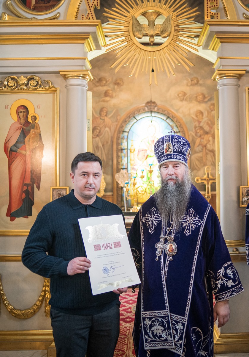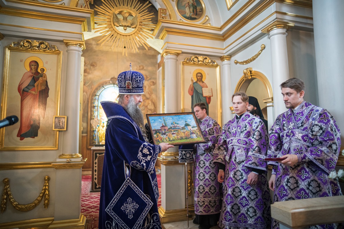 В завершение богослужения епископ Кирилл обратился к молящимся с проповедью и поздравил протоиерея Николая Косых с 40-летием со дня иерейской хиротонии. Его Преосвященство удостоил протоиерея Николая епархиальной медали священномученика Серафима (Звездинского), епископа Дмитровского, III степени, а также наградил благодарственной архиерейской грамотой генерального директора ООО «Центр исследования ДНК» И. Д. Ивановского. Затем протоиерей Николай Косых поблагодарил владыку за архипастырский визит и подарил ему чётки из натурального камня.
